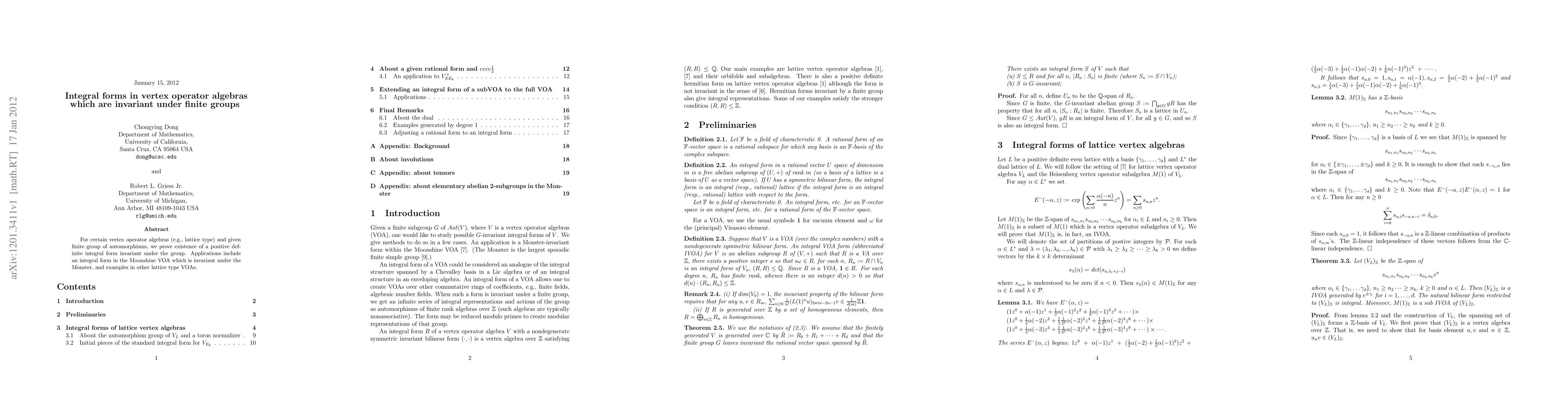 Summary: This paper proves the existence of positive definite integral forms in specific vertex operator algebras invariant under certain finite automorphism groups, with applications to the Moonshine VOA and other lattice-type VOAs. These results extend the understanding of group-invariant structures in vertex operator algebras.