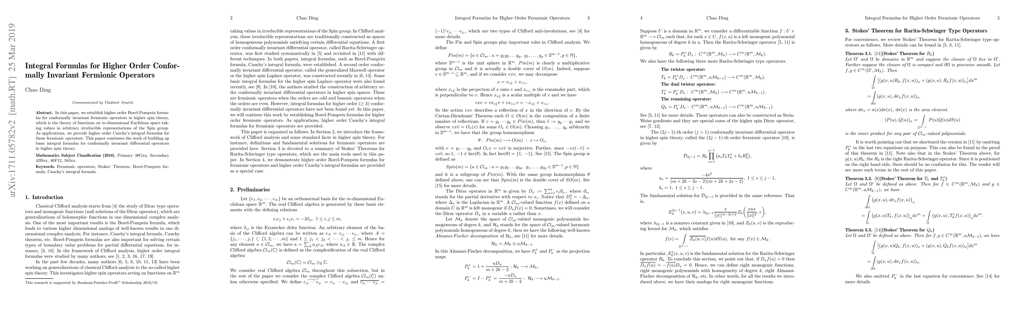In this paper, we establish higher order Borel-Pompeiu formulas for conformally invariant fermionic operators in higher spin theory, which is the theory of functions on m-dimensional Euclidean space taking values in arbitrary irreducible representations of the Spin group. As applications, we provide higher order Cauchy's integral formulas for those fermionic operators. This paper continues the work of building up basic integral formulas for conformally invariant differential operators in higher spin theory.