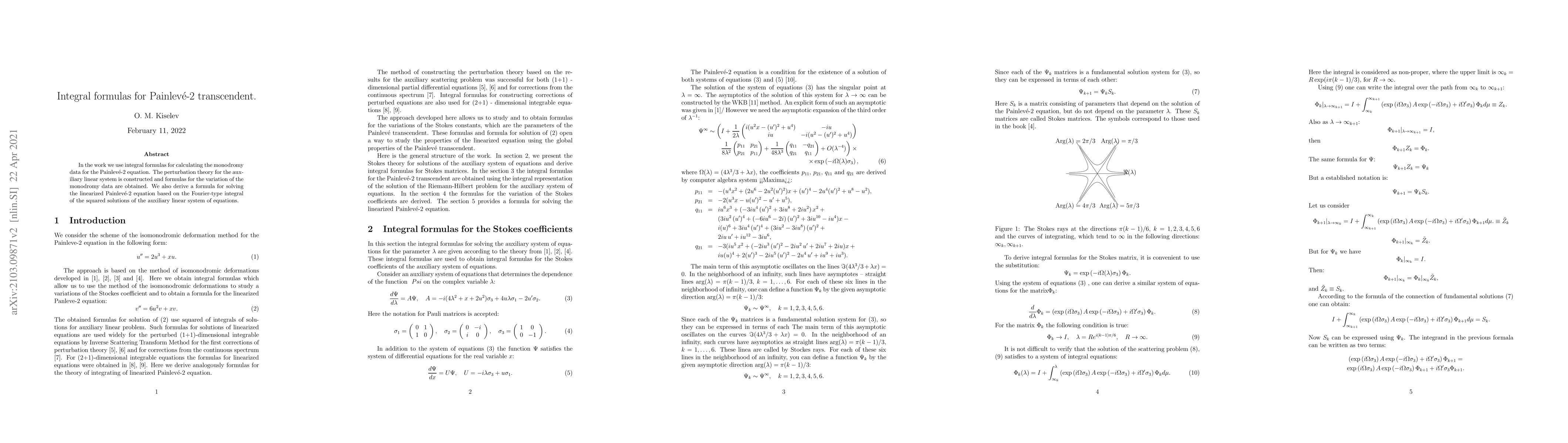 This paper develops integral formulas for calculating monodromy data of the Painlevé-2 equation, constructs perturbation theory for its auxiliary linear system, and derives a Fourier-type integral solution for the linearized Painlevé-2 equation based on squared solutions of the auxiliary system.