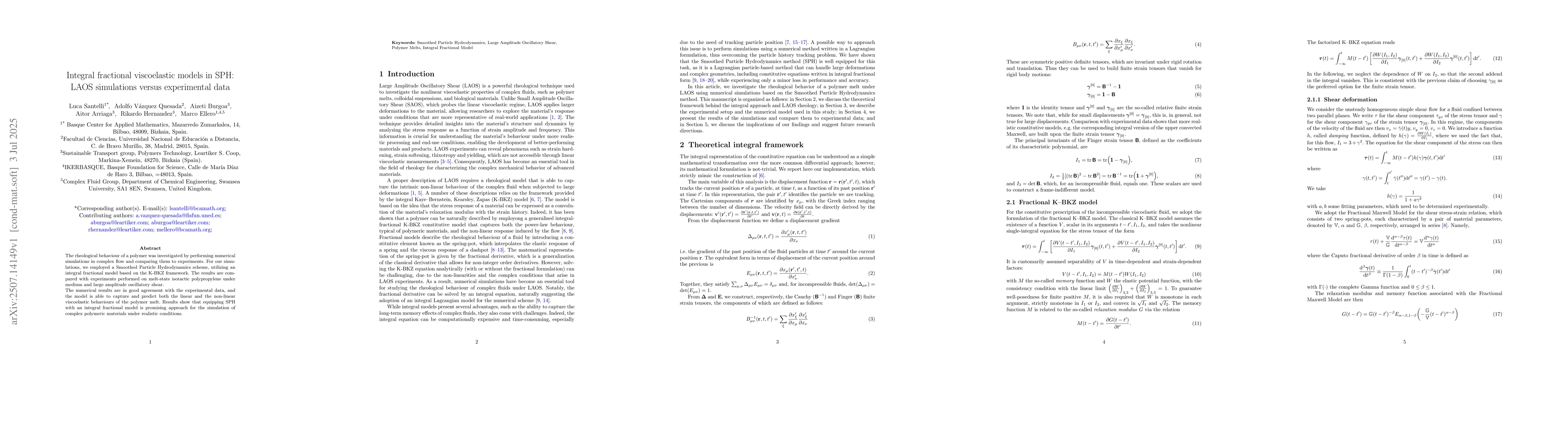 The rheological behaviour of a polymer was investigated by performing numerical simulations in complex flow and comparing them to experiments. For our simulations, we employed a Smoothed Particle Hydrodynamics scheme, utilizing an integral fractional model based on the K-BKZ framework. The results are compared with experiments performed on melt-state isotactic polypropylene under medium and large amplitude oscillatory shear. The numerical results are in good agreement with the experimental data, and the model is able to capture and predict both the linear and the non-linear viscoelastic behaviours of the polymer melt. Results show that equipping SPH with an integral fractional model is promising approach for the simulation of complex polymeric materials under realistic conditions.