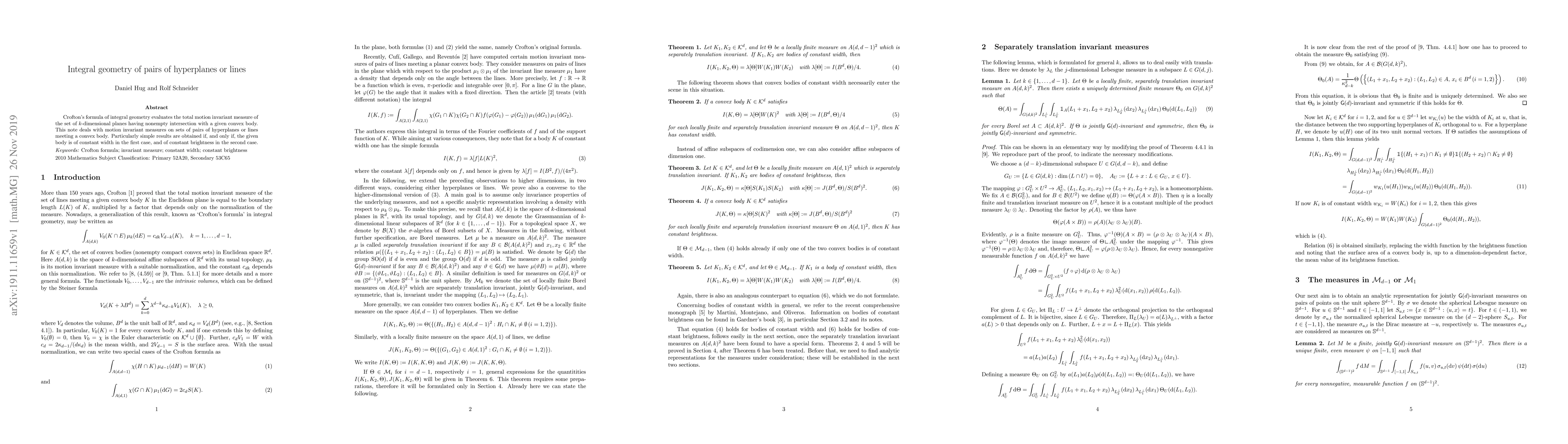 Crofton's formula of integral geometry evaluates the total motion invariant measure of the set of $k$-dimensional planes having nonempty intersection with a given convex body. This note deals with motion invariant measures on sets of pairs of hyperplanes or lines meeting a convex body. Particularly simple results are obtained if, and only if, the given body is of constant width in the first case, and of constant brightness in the second case.