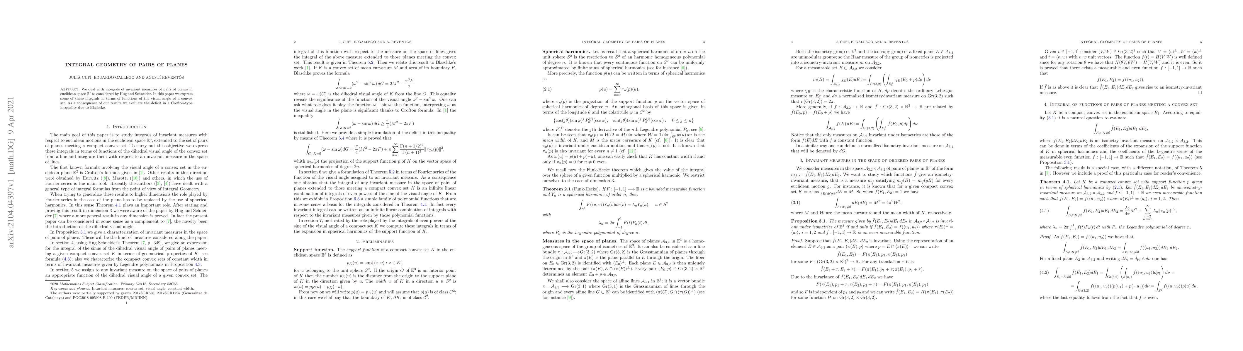 We deal with integrals of invariant measures of pairs of planes in euclidean space $\mathbb{E}^3$ as considered by Hug and Schneider. In this paper we express some of these integrals in terms of functions of the visual angle of a convex set. As a consequence of our results we evaluate the deficit in a Crofton-type inequality due to Blashcke.
