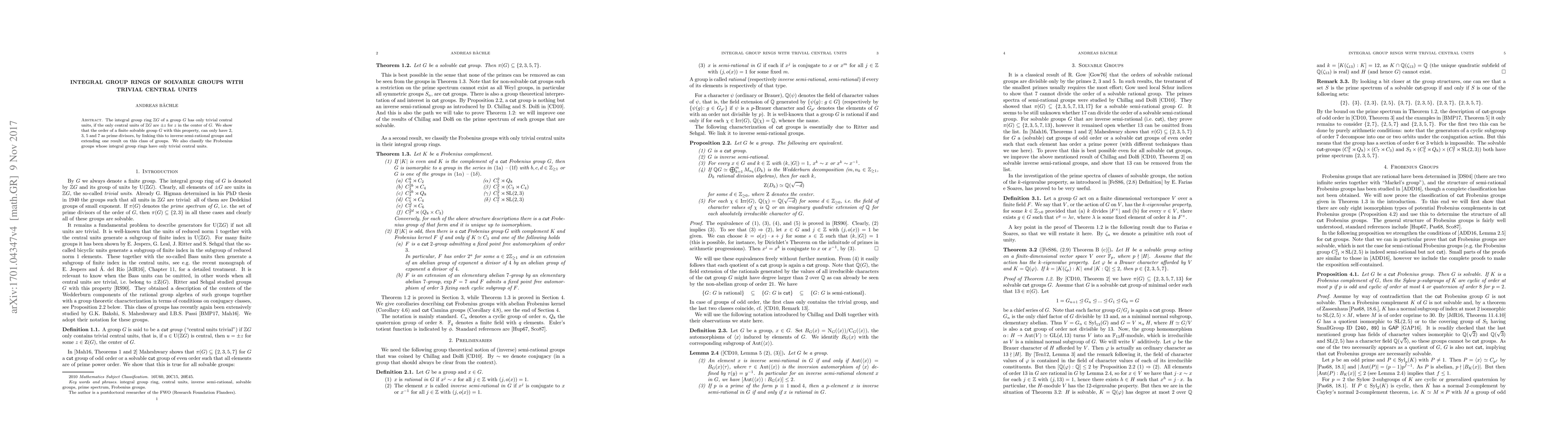 The integral group ring $\mathbb{Z} G$ of a group $G$ has only trivial central units, if the only central units of $\mathbb{Z} G$ are $\pm z$ for $z$ in the center of $G$. We show that the order of a finite solvable group $G$ with this property, can only have $2$, $3$, $5$ and $7$ as prime divisors, by linking this to inverse semi-rational groups and extending one result on this class of groups. We also classify the Frobenius groups whose integral group rings have only trivial central units.