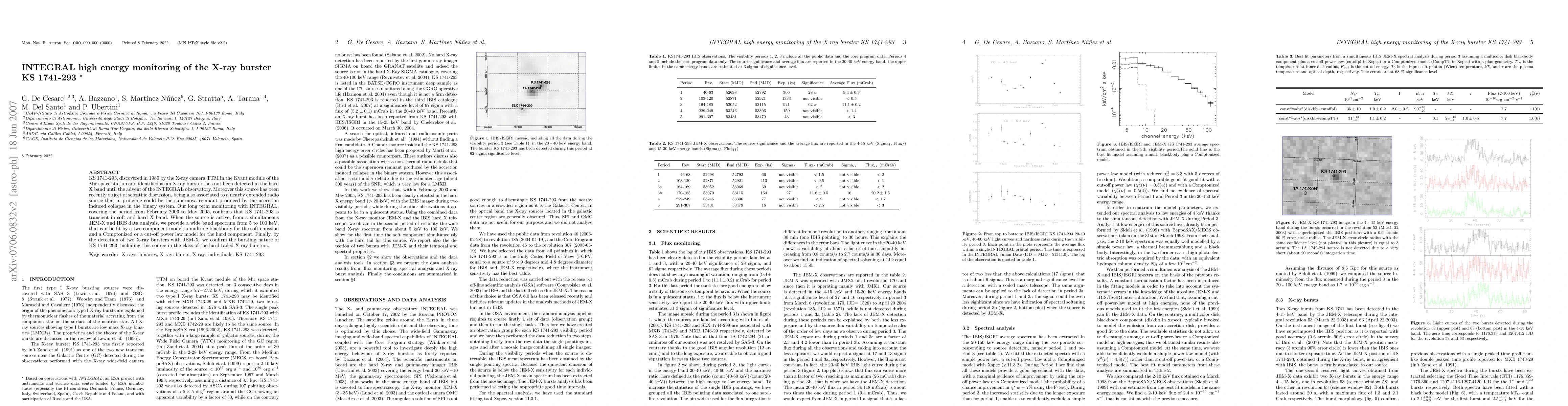 KS 1741-293, discovered in 1989 by the X-ray camera TTM in the Kvant module of the Mir space station and identified as an X-ray burster, has not been detected in the hard X band until the advent of the INTEGRAL observatory. Moreover this source has been recently object of scientific discussion, being also associated to a nearby extended radio source that in principle could be the supernova remnant produced by the accretion induced collapse in the binary system. Our long term monitoring with INTEGRAL, covering the period from February 2003 to May 2005, confirms that KS 1741-293 is transient in soft and hard X band. When the source is active, from a simultaneous JEM-X and IBIS data analysis, we provide a wide band spectrum from 5 to 100 keV, that can be fit by a two component model, a multiple blackbody for the soft emission and a Comptonized or a cut-off power law model for the hard component. Finally, by the detection of two X-ray bursters with JEM-X, we confirm the bursting nature of KS 1741-293, including this source in the class of the hard tailed X-ray bursters.