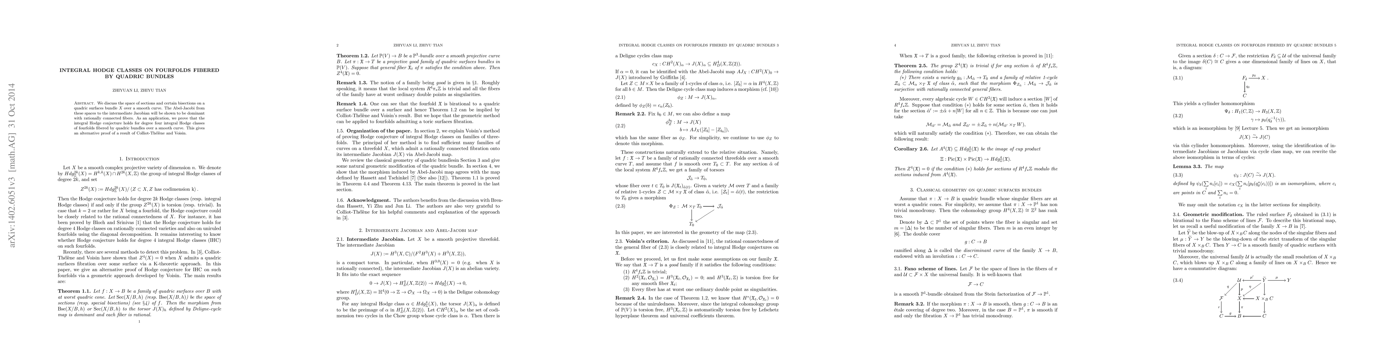 The paper explores the structure of quadric surface bundles and demonstrates that the Abel-Jacobi map from sections to the intermediate Jacobian is dominant with rationally connected fibers. It concludes by proving the integral Hodge conjecture for degree four classes in fourfolds fibered by such quadric bundles, offering an alternative proof to the result by Colliot-Thélène and Voisin.