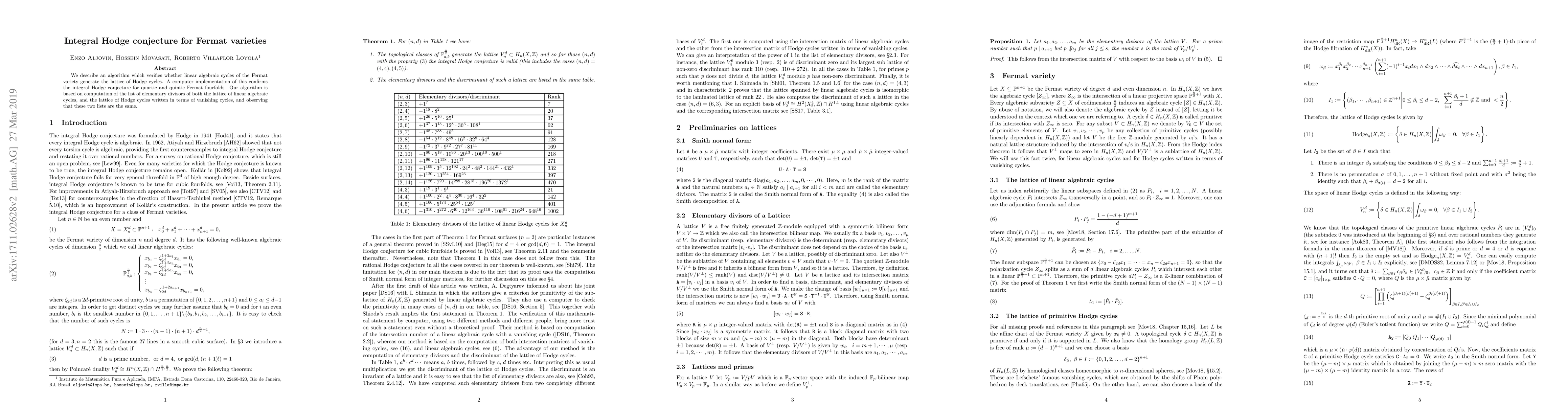 The paper presents an algorithm to verify the integral Hodge conjecture for Fermat varieties by comparing the elementary divisors of the lattices of linear algebraic cycles and Hodge cycles. Computational results confirm the conjecture for quartic and quintic Fermat fourfolds.