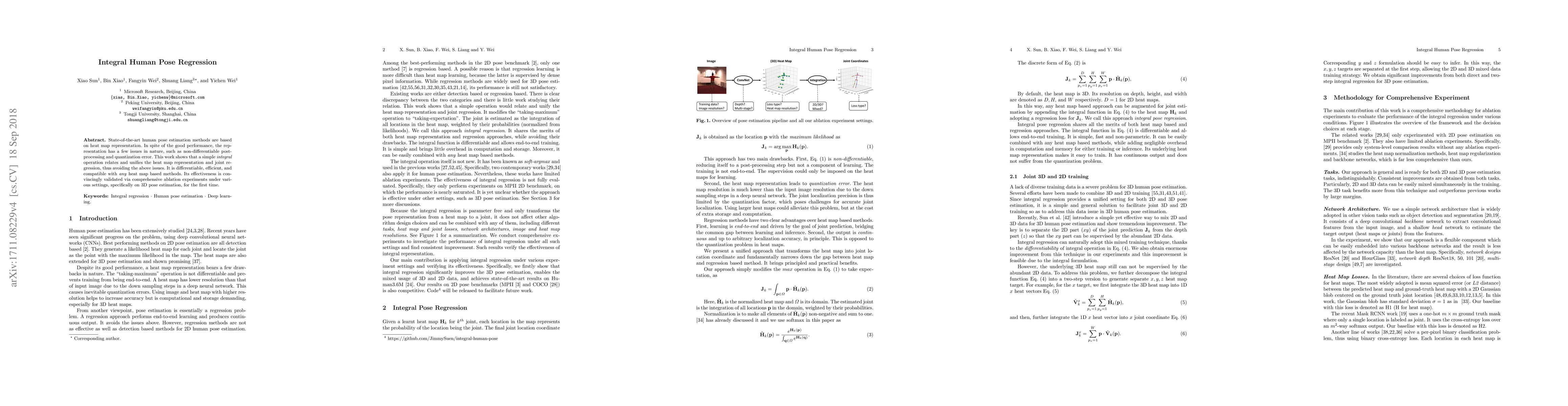 This paper proposes an integral operation to unify heat map representation and joint regression for human pose estimation, addressing non-differentiability and quantization errors. The method is differentiable, efficient, and compatible with existing heat map-based methods, validated through comprehensive ablation studies on 3D pose estimation.