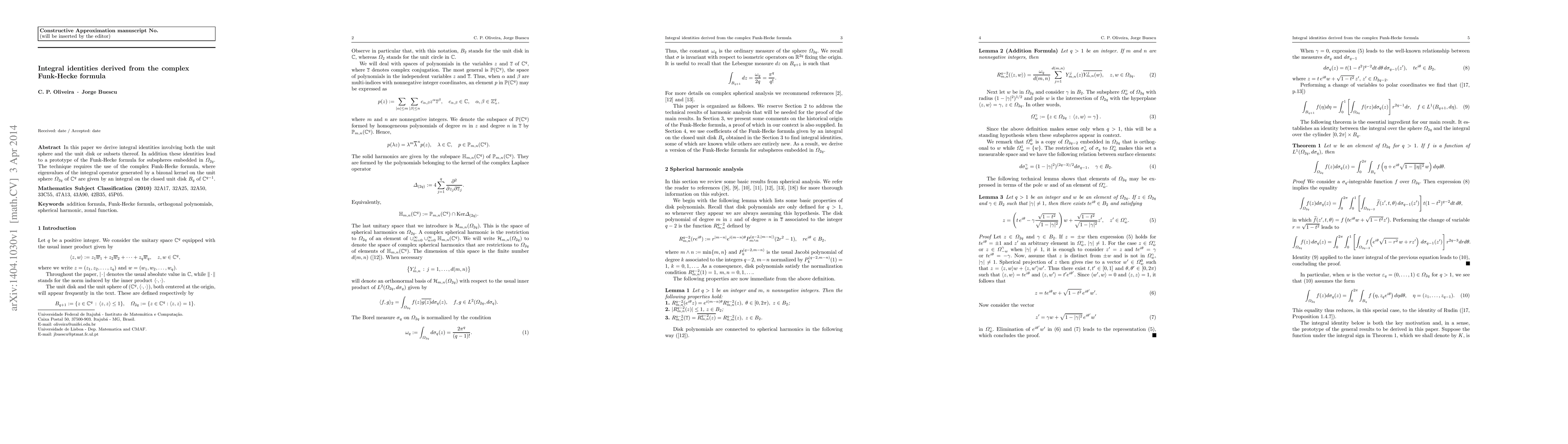 In this paper we derive integral identities involving both the unit sphere and the unit disk or subsets thereof. In addition these identities lead to a prototype of the Funk-Hecke formula for subspheres embedded in $\Omega_{2q}$. The technique requires the use of the complex Funk-Hecke formula, where eigenvalues of the integral operator generated by a bizonal kernel on the unit sphere $\Omega_{2q}$ of $\mathbb{C}^q$ are given by an integral on the closed unit disk $B_q$ of $\mathbb{C}^{q-1}$.