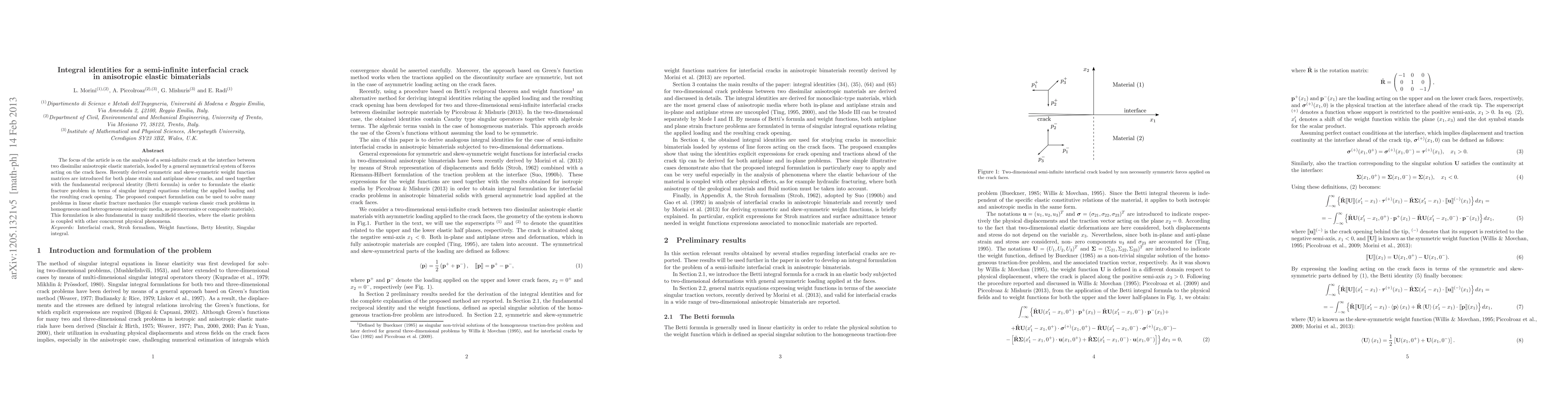The focus of the article is on the analysis of a semi-infinite crack at the interface between two dissimilar anisotropic elastic materials, loaded by a general asymmetrical system of forces acting on the crack faces. Recently derived symmetric and skew-symmetric weight function matrices are introduced for both plane strain and antiplane shear cracks, and used together with the fundamental reciprocal identity (Betti formula) in order to formulate the elastic fracture problem in terms of singular integral equations relating the applied loading and the resulting crack opening. The proposed compact formulation can be used to solve many problems in linear elastic fracture mechanics (for example various classic crack problems in homogeneous and heterogeneous anisotropic media, as piezoceramics or composite materials). This formulation is also fundamental in many multifield theories, where the elastic problem is coupled with other concurrent physical phenomena.