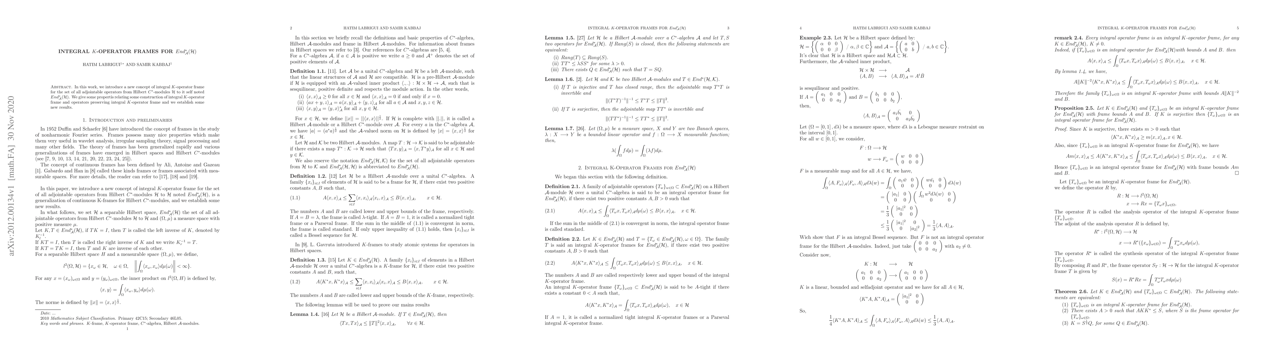 This paper introduces the concept of integral $K$-operator frames for adjointable operators in Hilbert $C^{\ast}$-modules, establishing properties and constructions related to these frames and operators that preserve them, along with new theoretical results.