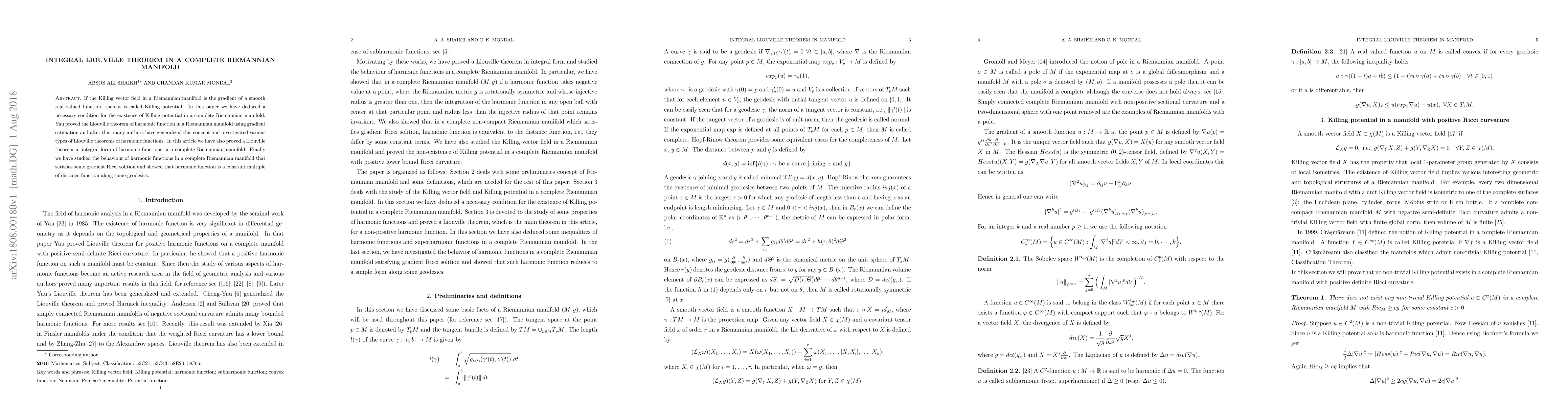 This paper deduces a necessary condition for the existence of Killing potential in complete Riemannian manifolds and proves an integral Liouville theorem for harmonic functions, establishing that such functions are constant multiples of distance functions along geodesics satisfying certain gradient Ricci conditions.