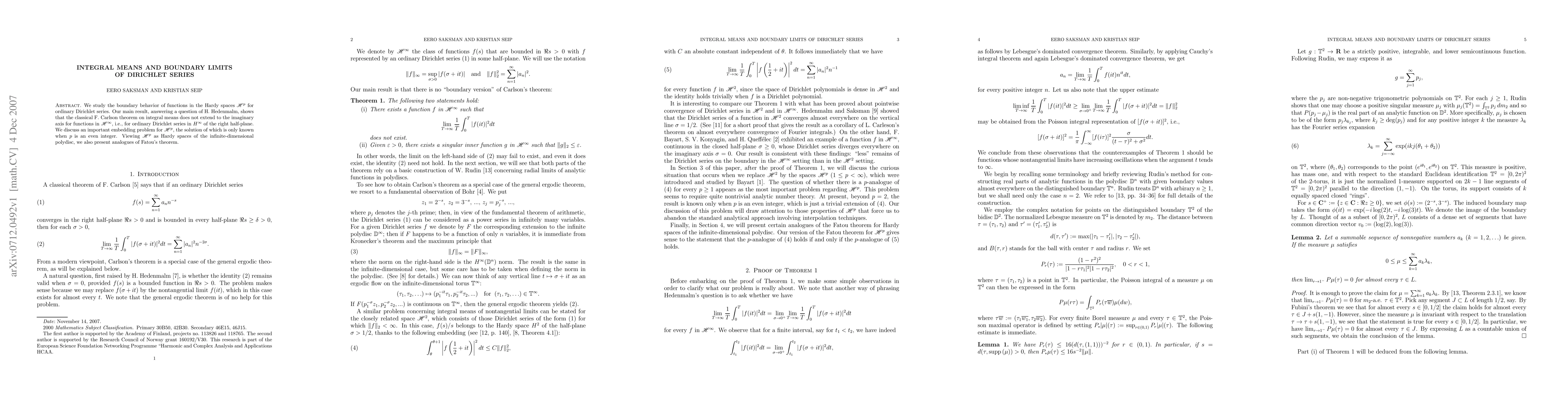 This paper investigates the boundary behavior of functions in Hardy spaces HD^p for ordinary Dirichlet series, demonstrating that the F. Carlson theorem on integral means does not extend to the imaginary axis for HD^\infty functions. The authors also explore embedding problems for HD^p and present analogues of Fatou's theorem in the context of infinite-dimensional polydiscs.