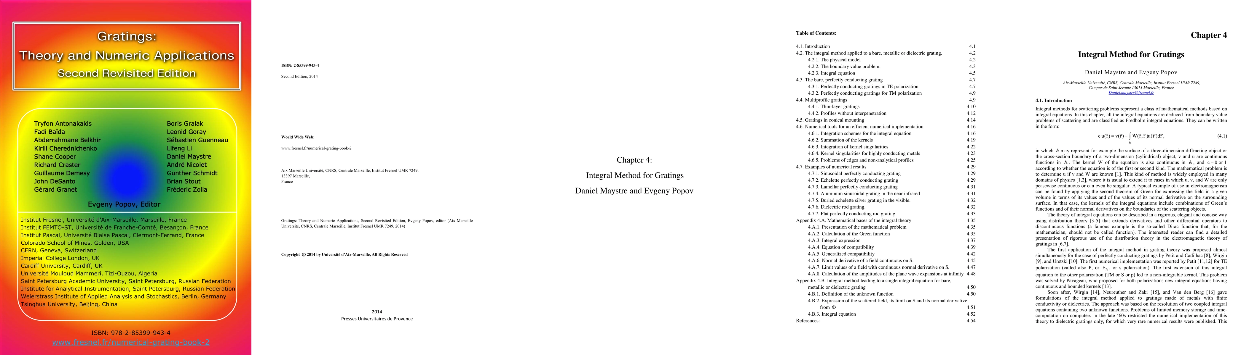 The chapter contains a detailed presentation of the surface integral theory for modelling light diffraction by surface-relief diffraction gratings having a one-dimensional periodicity. Several different approaches are presented, leading either to a single integral equation, or to a system of coupled integral equations. Special attention is paid to the singularities of the kernels, and to different techniques to accelerate the convergence of the numerical computations. The theory is applied to gratings having different profiles with or without edges, to real metal and dielectrics, and to perfectly conducting substrates.