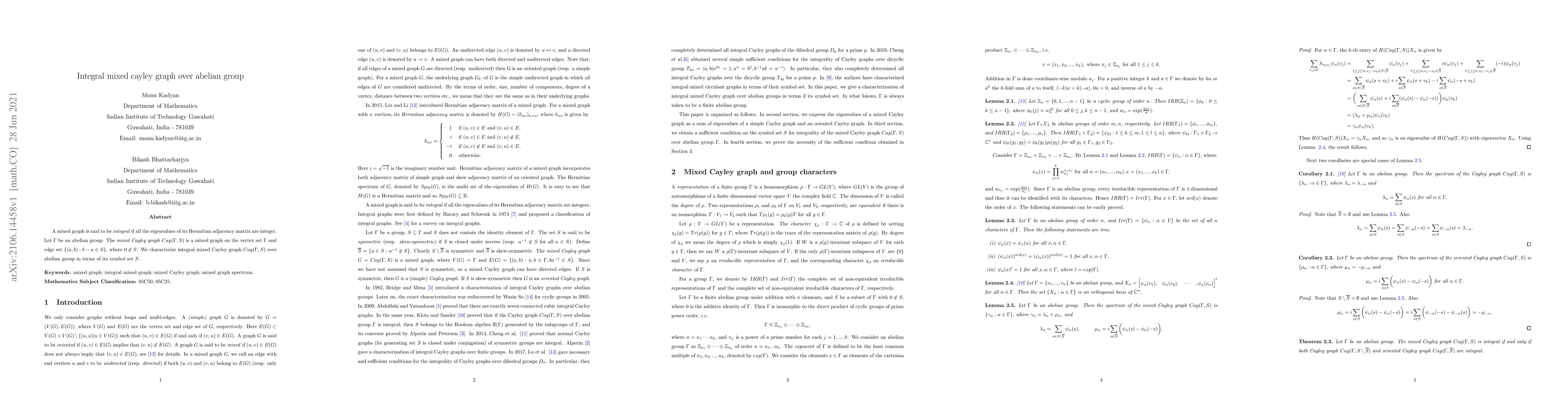 This paper characterizes integral mixed Cayley graphs over abelian groups in terms of their symbol sets, providing a new understanding of the relationship between graph structure and eigenvalue properties.