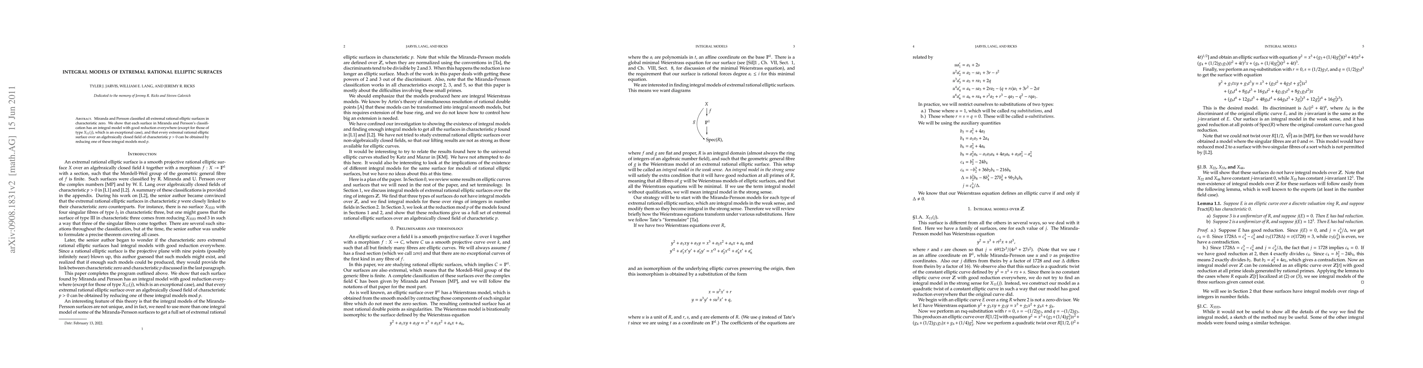 This paper demonstrates that every extremal rational elliptic surface from Miranda and Persson's classification possesses an integral model with good reduction everywhere, except for type X_{11}(j). It also shows that surfaces in positive characteristic can be derived by reducing these integral models modulo p.