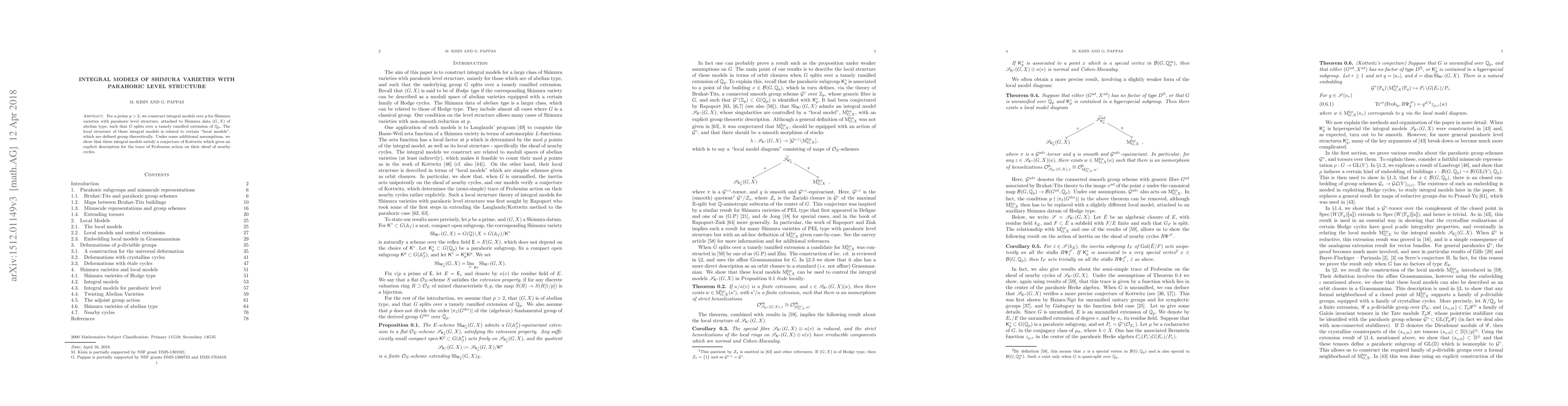 This paper constructs integral models over p for Shimura varieties with parahoric level structure, proving their local structure aligns with group-theoretic "local models." It also verifies a conjecture by Kottwitz on the trace of Frobenius action on these models under certain conditions.