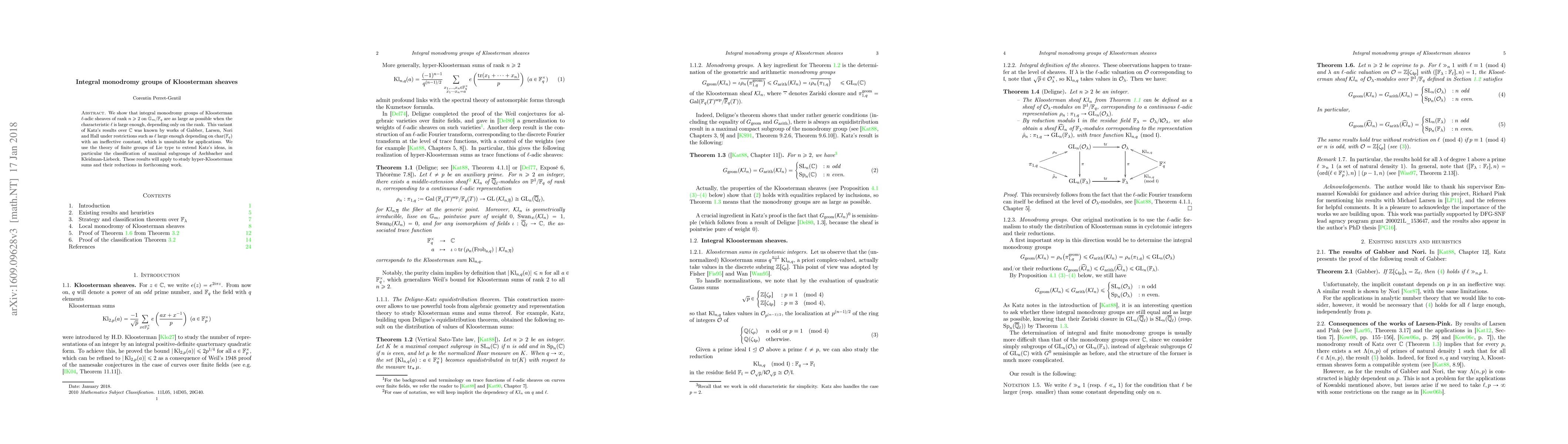 We show that integral monodromy groups of Kloosterman $\ell$-adic sheaves of rank $n\ge 2$ on $\mathbb{G}_m/\mathbb{F}_q$ are as large as possible when the characteristic $\ell$ is large enough, depending only on the rank. This variant of Katz's results over $\mathbb{C}$ was known by works of Gabber, Larsen, Nori and Hall under restrictions such as $\ell$ large enough depending on $\operatorname{char}(\mathbb{F}_q)$ with an ineffective constant, which is unsuitable for applications. We use the theory of finite groups of Lie type to extend Katz's ideas, in particular the classification of maximal subgroups of Aschbacher and Kleidman-Liebeck. These results will apply to study reductions of hyper-Kloosterman sums in forthcoming work.