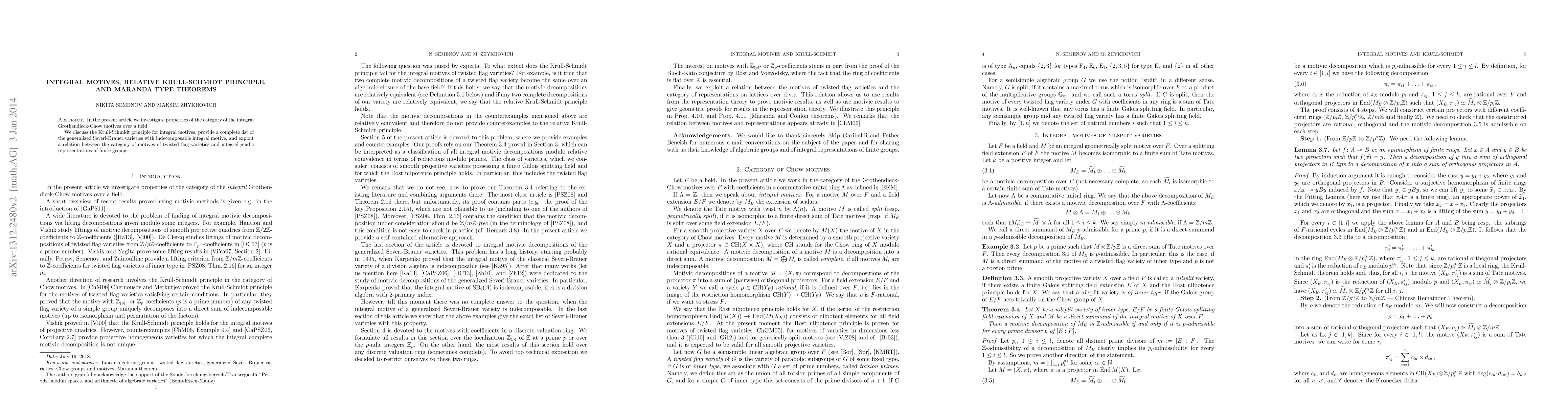 In the present article we investigate properties of the category of the integral Grothendieck-Chow motives over a field. We discuss the Krull-Schmidt principle for integral motives, provide a complete list of the generalized Severi-Brauer varieties with indecomposable integral motive, and exploit a relation between the category of motives of twisted flag varieties and integral $p$-adic representations of finite groups.