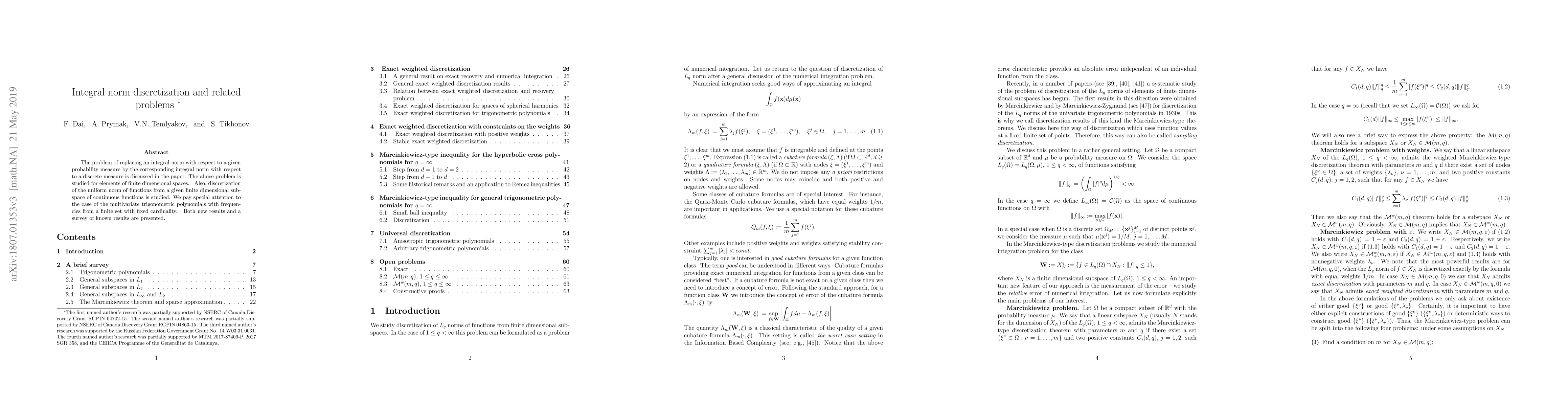 The problem of replacing an integral norm with respect to a given probability measure by the corresponding integral norm with respect to a discrete measure is discussed in the paper. The above problem is studied for elements of finite dimensional spaces. Also, discretization of the uniform norm of functions from a given finite dimensional subspace of continuous functions is studied. We pay special attention to the case of the multivariate trigonometric polynomials with frequencies from a finite set with fixed cardinality. Both new results and a survey of known results are presented.