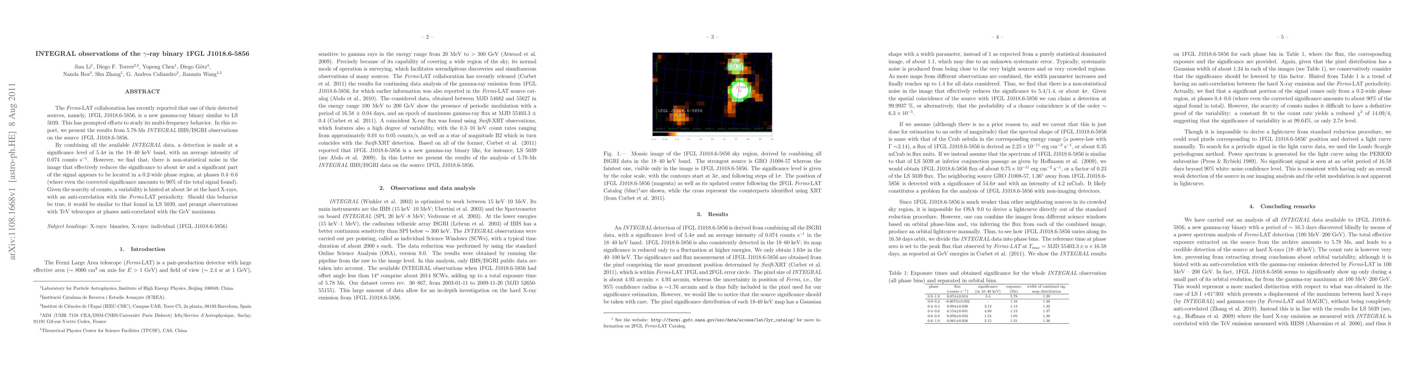 The INTEGRAL collaboration detects gamma-ray binary 1FGL J1018.6-5856 with a significance level of 5.4 sigma, showing variability at hard X-rays and anti-correlation with Fermi-LAT periodicity.