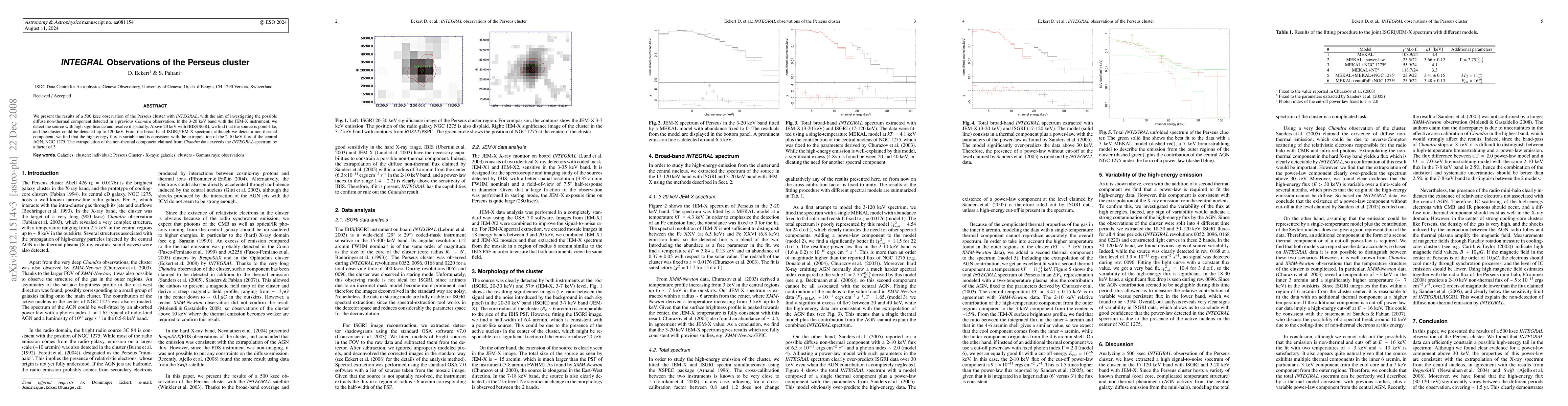 The INTEGRAL observation of the Perseus cluster reveals a significant diffuse non-thermal component in the 3-20 keV band, with the source being point-like above 20 keV. The high-energy flux is variable and aligns with the extrapolation of the central AGN NGC 1275's 2-10 keV flux, contradicting the higher extrapolation from previous Chandra data.