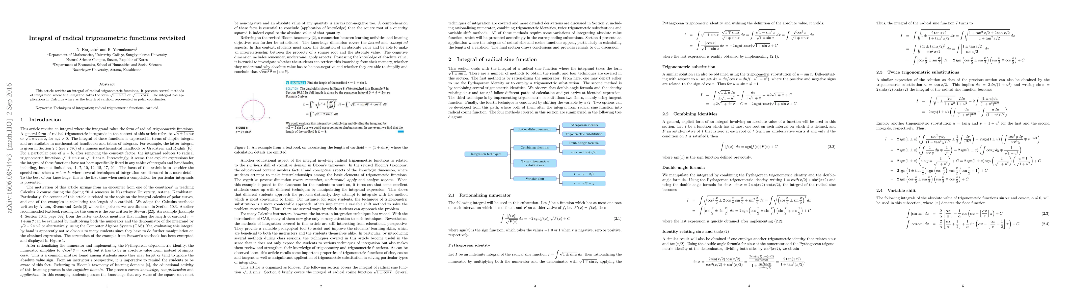 This paper revisits an integral of radical trigonometric functions with applications in Calculus, providing new methods for integration of $rac{1}{2} rac{ ext d x}{ ext s i n^{-rac{1}{2}} ( x )}$ and similar expressions.