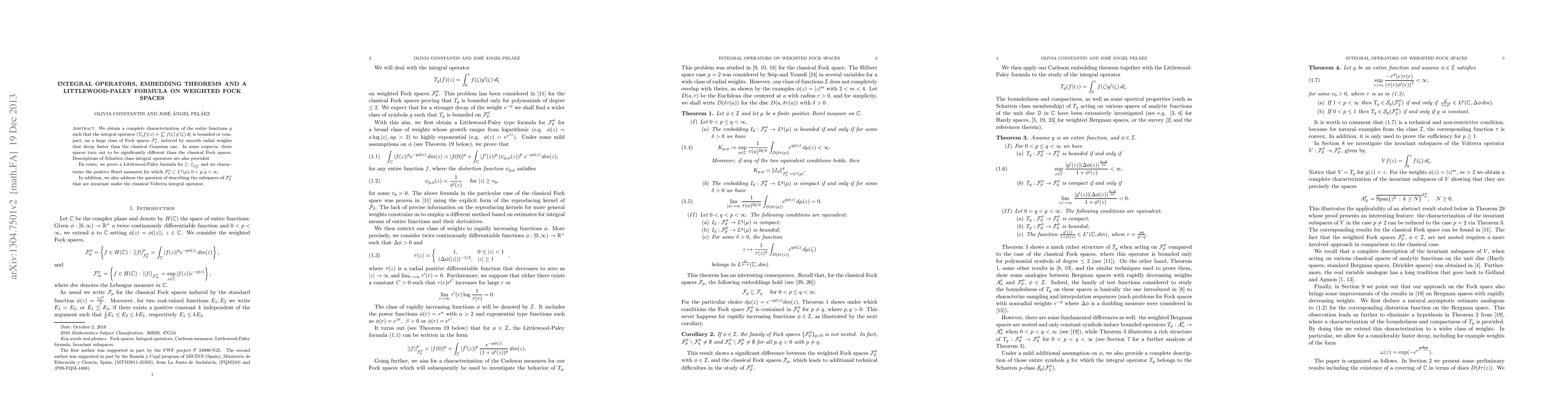 This paper characterizes entire functions for which integral operators on weighted Fock spaces are bounded or compact, and provides descriptions of Schatten class integral operators. It also proves a Littlewood-Paley formula for these spaces and identifies positive Borel measures for which the spaces are included in $L^q$.