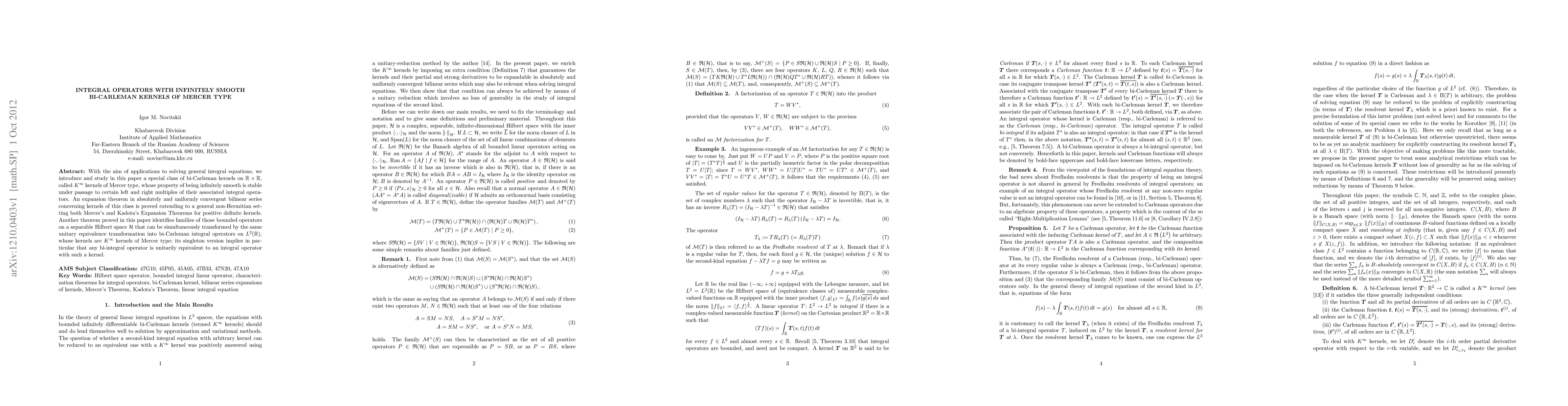 With the aim of applications to solving general integral equations, we introduce and study in this paper a special class of bi-Carleman kernels on $\mathbb{R}\times\mathbb{R}$, called $K^\infty$ kernels of Mercer type, whose property of being infinitely smooth is stable under passage to certain left and right multiples of their associated integral operators. An expansion theorem in absolutely and uniformly convergent bilinear series concerning kernels of this class is proved extending to a general non-Hermitian setting both Mercer's and Kadota's Expansion Theorems for positive definite kernels. Another theorem proved in this paper identifies families of those bounded operators on a separable Hilbert space $\mathcal{H}$ that can be simultaneously transformed by the same unitary equivalence transformation into bi-Carleman integral operators on $L^2(\mathbb{R})$, whose kernels are $K^\infty$ kernels of Mercer type; its singleton version implies in particular that any bi-integral operator is unitarily equivalent to an integral operator with such a kernel.
