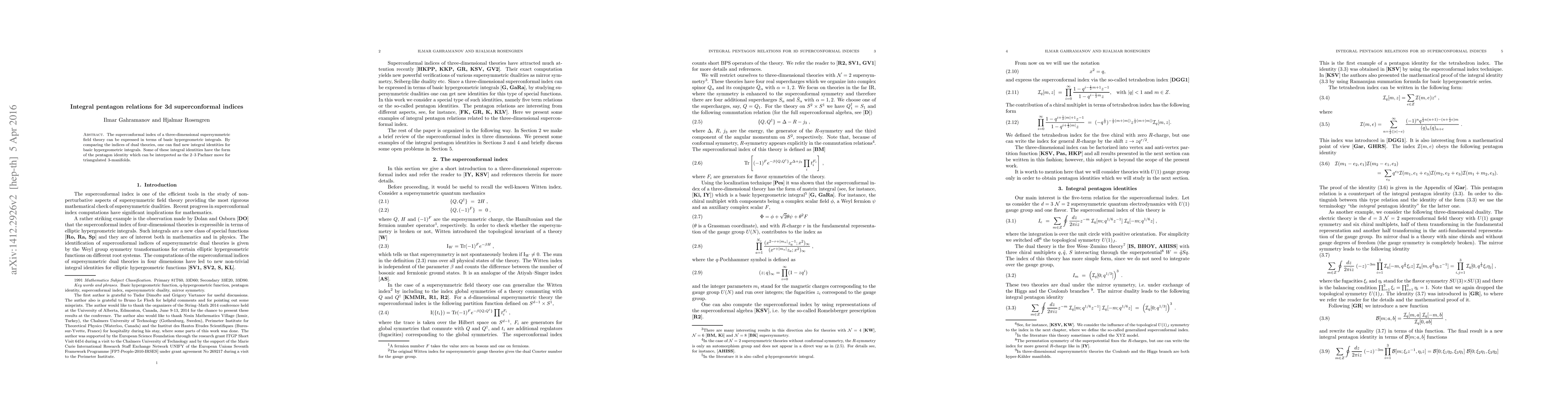 Summary: This paper explores integral identities derived from the superconformal indices of three-dimensional supersymmetric field theories, specifically focusing on the pentagon identity, which corresponds to the 2-3 Pachner move in triangulated 3-manifolds. These identities reveal deeper connections between dual theories and basic hypergeometric integrals.