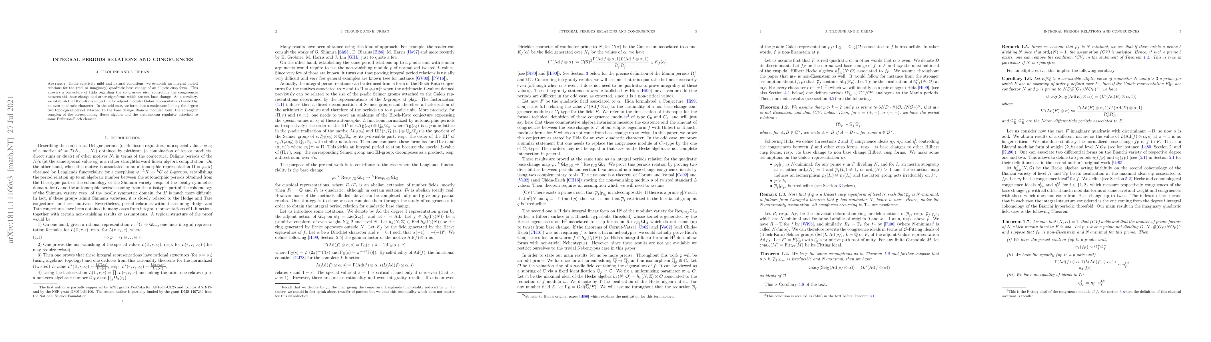 This paper establishes integral period relations for quadratic base change of elliptic cusp forms, confirming Hida's conjecture on congruence numbers. It also proves the Bloch-Kato conjecture for adjoint modular Galois representations twisted by an even quadratic character, and proposes a new conjecture linking period, Hecke algebra cotangent complex, and archimedean regulator in the odd case.