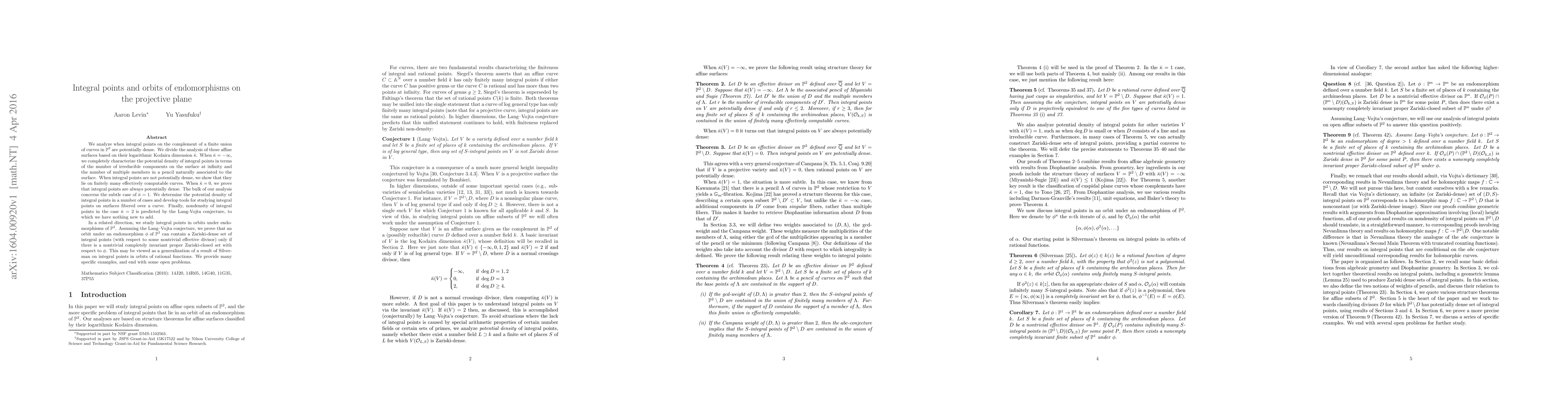 This paper investigates the potential density of integral points on affine surfaces in $\mathbb{P}^2$ and their orbits under endomorphisms. It characterizes the density based on the logarithmic Kodaira dimension, proving density for $\bar{\kappa} = 0$ and non-density for $\bar{\kappa} = -\infty$ and $\bar{\kappa} = 2$. It also explores the Lang-Vojta conjecture in the context of endomorphism orbits, showing that dense orbits require nontrivial invariant sets.