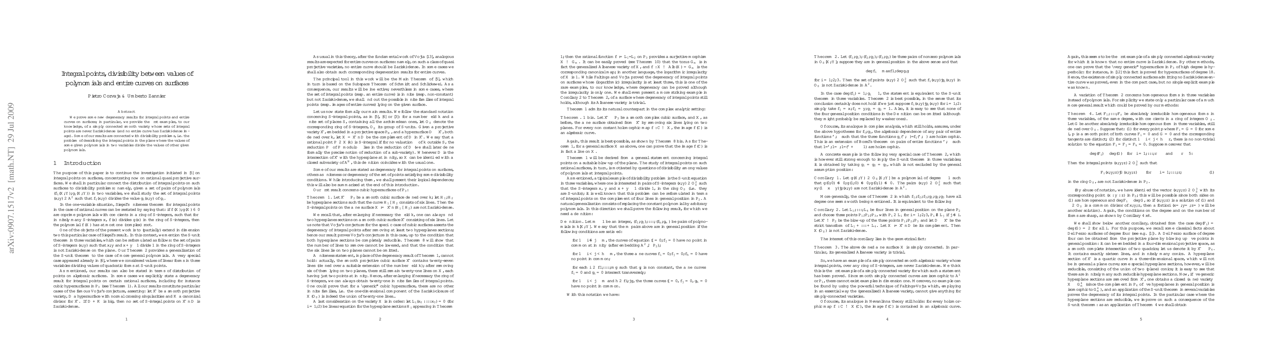 This paper presents new findings on integral points and entire curves on surfaces, specifically demonstrating a simply connected smooth variety where integral points and entire curves do not form Zariski-dense sets. It also explores divisibility problems between polynomial values in the plane.