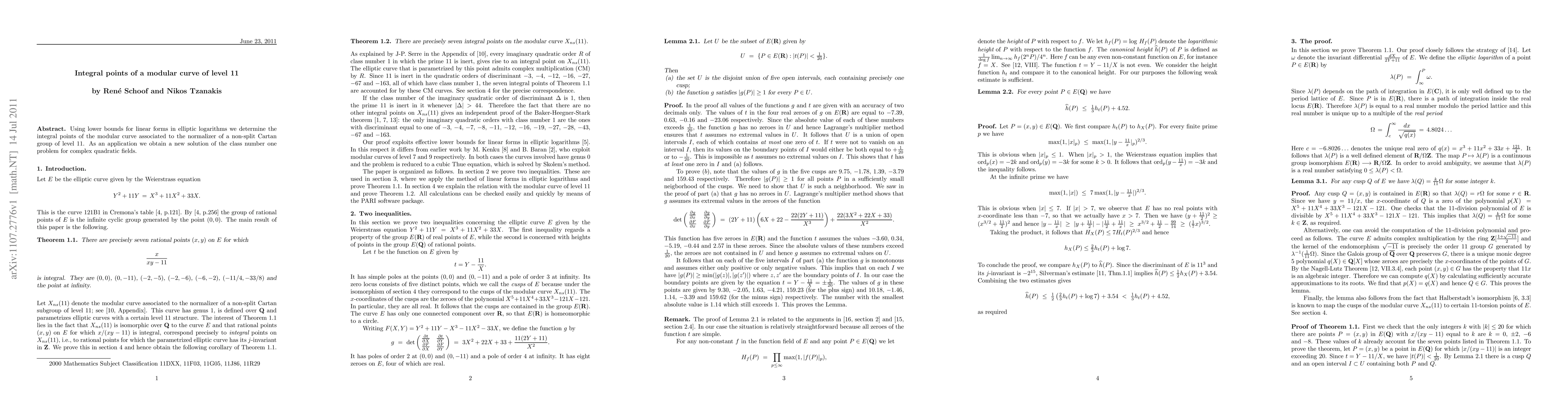 This paper determines integral points on a modular curve related to the normalizer of a non-split Cartan group at level 11, leveraging lower bounds for linear forms in elliptic logarithms. It also presents a new solution to the class number one problem for complex quadratic fields.