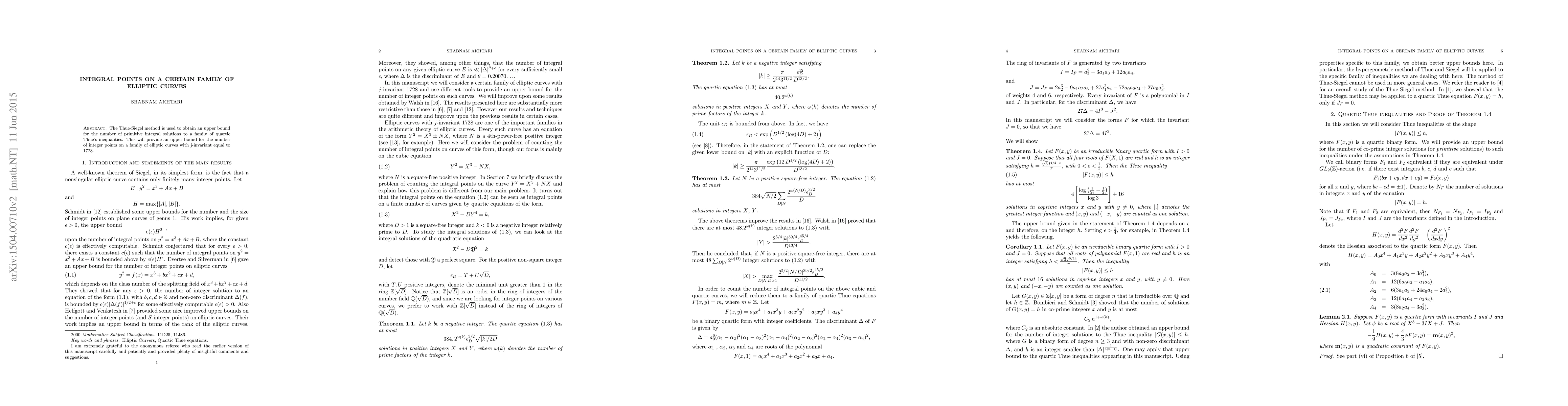 Summary: The Thue-Siegel method is applied to find an upper bound for primitive integral solutions to a set of quartic Thue inequalities, thereby determining the maximum number of integer points on a specific family of elliptic curves with a j-invariant of 1728.