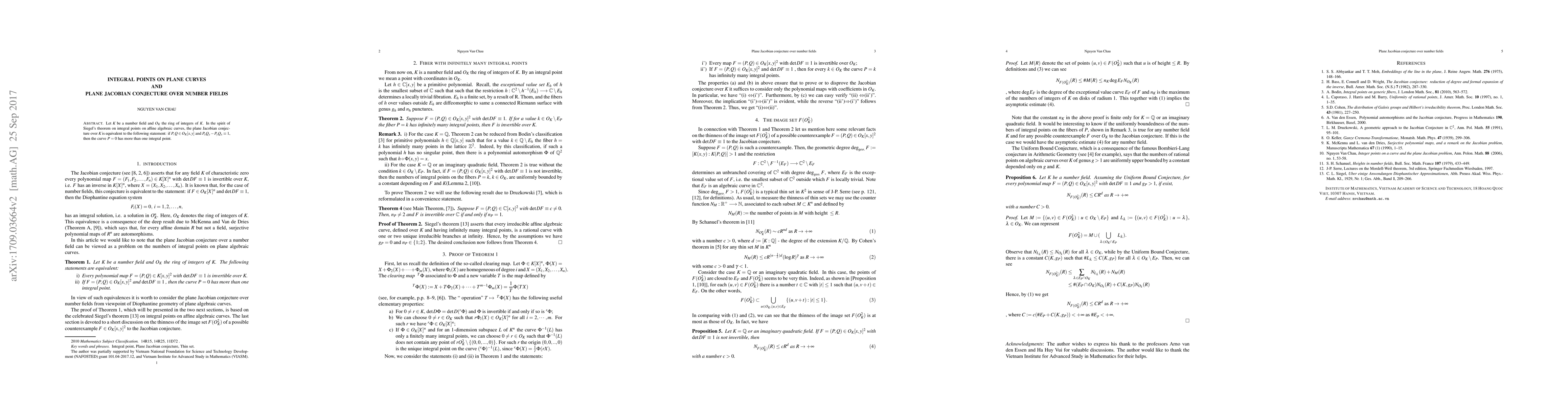 This paper investigates the plane Jacobian conjecture over number fields, linking it to Siegel's theorem on integral points on affine algebraic curves, specifically asserting that if polynomials $P$ and $Q$ satisfy $P_xQ_y-P_yQ_x\equiv 1$, then the curve defined by $P=0$ must possess more than one integral point.
