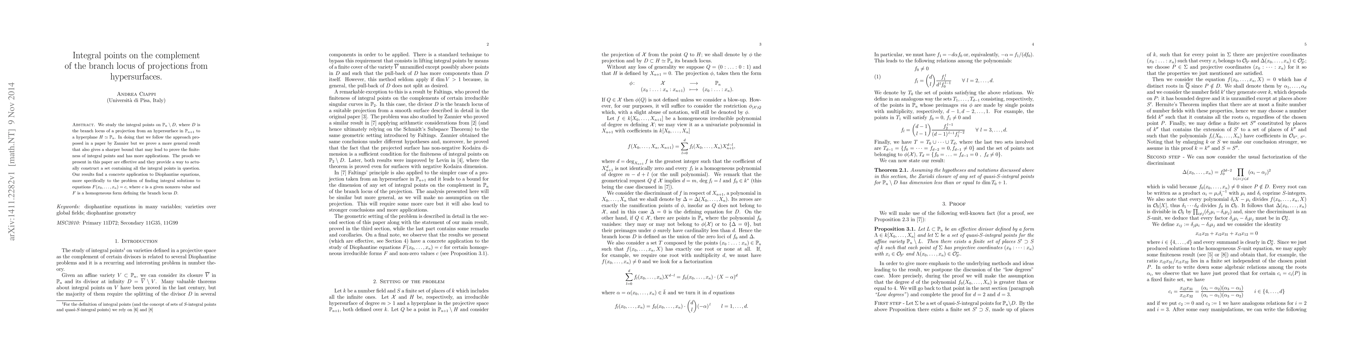 We study the integral points on $\mathbb P_ n\setminus D$, where $D$ is the branch locus of a projection from an hypersurface in $\mathbb P_{n+1}$ to a hyperplane $H\simeq\mathbb P_n$. In doing that we follow the approach proposed in a paper by Zannier but we prove a more general result that also gives a sharper bound that may lead to prove the finiteness of integral points and has more applications. The proofs we present in this paper are effective and they provide a way to actually construct a set containing all the integral points in question. Our results find a concrete application to Diophantine equations, more specifically to the problem of finding integral solutions to equations $F(x_0,\dots,x_n)=c$, where $c$ is a given nonzero value and $F$ is a homogeneous form defining the branch locus $D$.