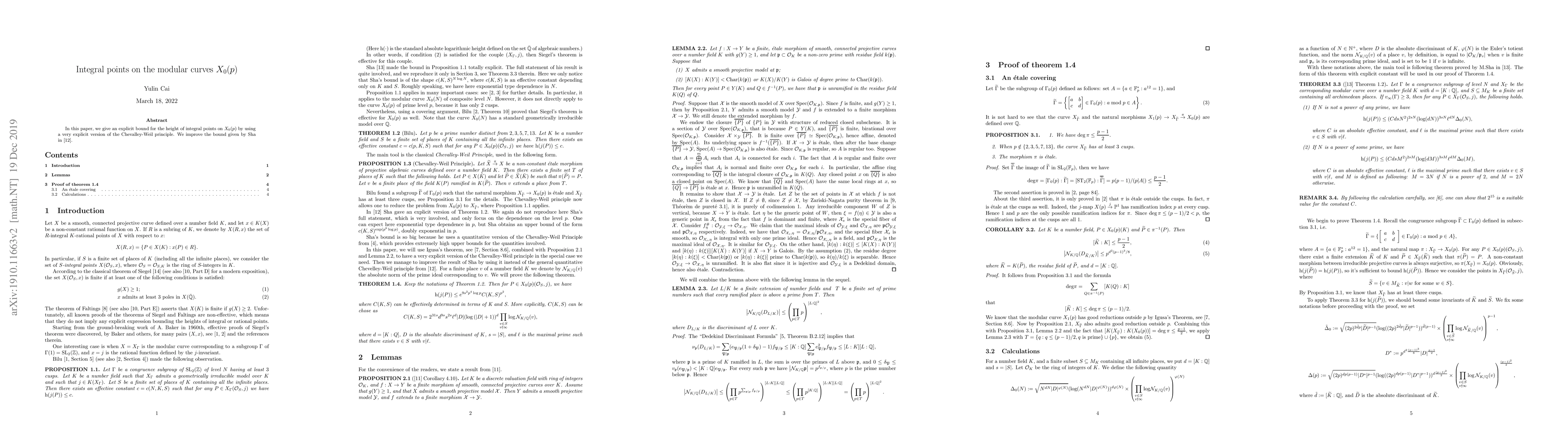 This paper provides an explicit bound for the height of integral points on modular curves $X_0(p)$ using a refined version of the Chevalley-Weil principle, surpassing the previous bound established by Sha.