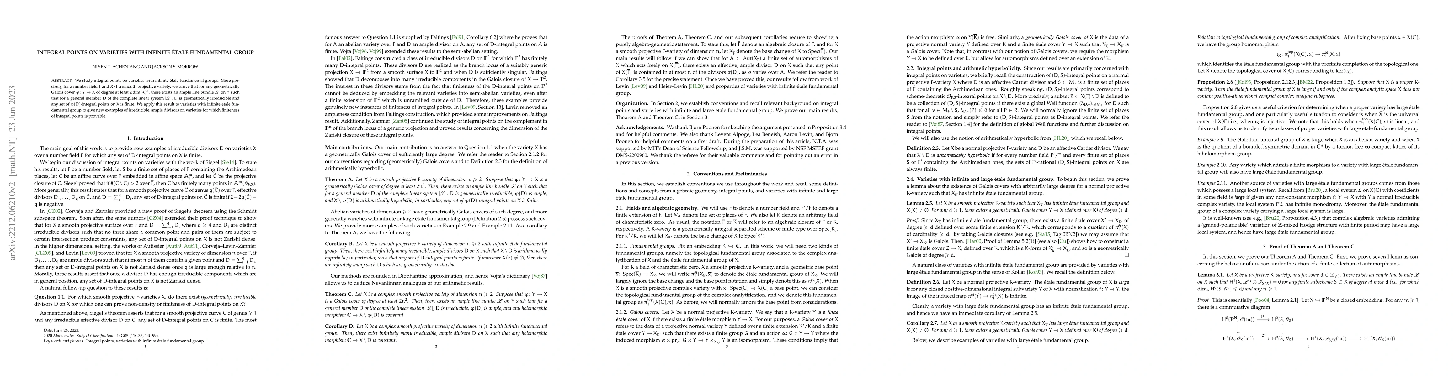 This paper proves that for smooth projective varieties with infinite étale fundamental groups over a number field, there exists an ample line bundle on a Galois cover of degree at least $2\dim(X)^2$ whose general member yields geometrically irreducible divisors, ensuring the finiteness of integral points on the original variety. This result provides new examples of irreducible, ample divisors with finite integral points.