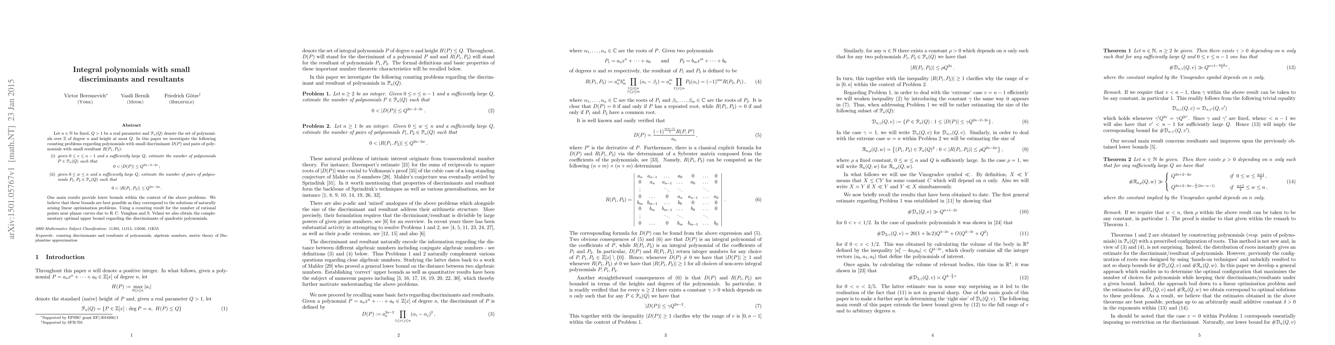 This paper investigates counting problems for integral polynomials of degree $n$ with small discriminants and resultants. It provides lower bounds for the number of such polynomials and their pairs, and demonstrates that these bounds are likely optimal, supported by linear optimization solutions and results from Vaughan and Velani on rational points near planar curves.