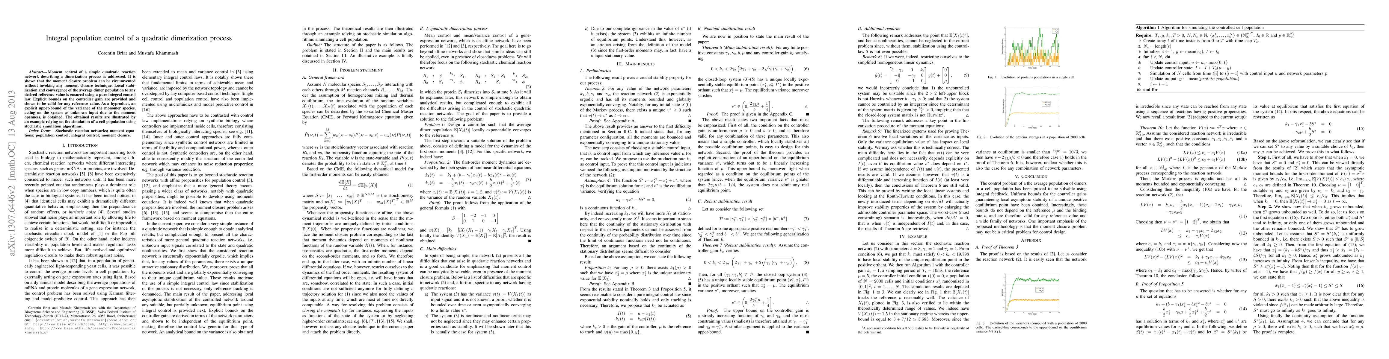 The research employs integral control for managing the average population of dimers in a cell population, demonstrating that moment closure techniques are not necessary. It provides explicit bounds on the controller gain for local exponential stability.