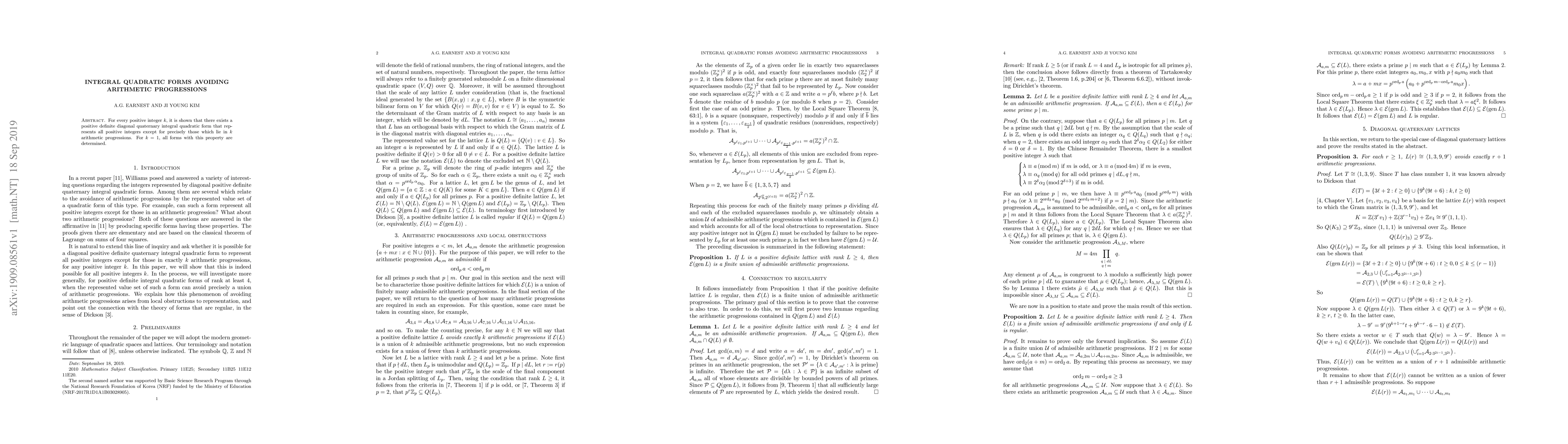 Summary: The paper demonstrates the existence of a positive definite diagonal quaternary integral quadratic form that excludes positive integers in k arithmetic progressions, with a complete determination for k=1. This result highlights the intricate relationship between quadratic forms and arithmetic progressions.