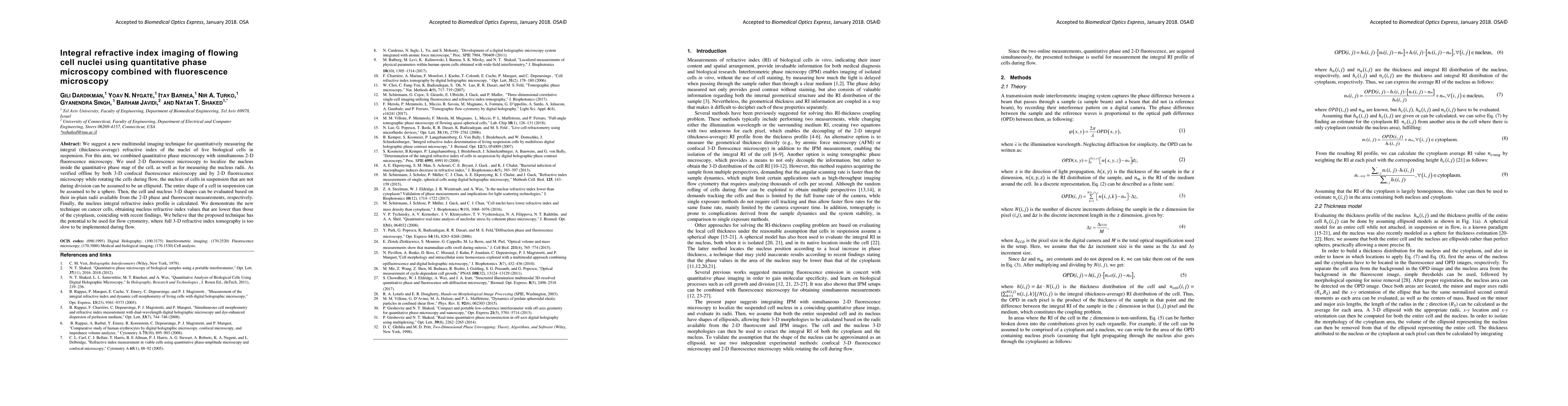 This paper proposes a new multimodal imaging technique combining quantitative phase microscopy with fluorescence microscopy to measure the integral refractive index of flowing cell nuclei in live cells. The method localizes and measures nuclei shapes and sizes, enabling calculation of their refractive index profiles, demonstrated effectively on cancer cells.