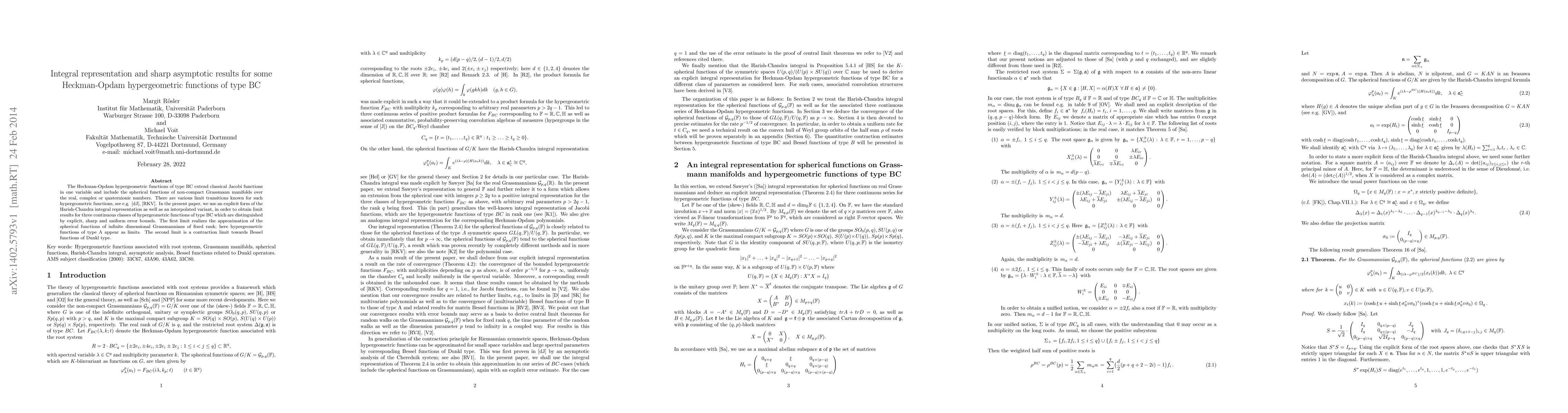 This paper explores Heckman-Opdam hypergeometric functions of type BC, providing integral representations and sharp asymptotic results. It uses Harish-Chandra integral representations to derive limit results for three classes, achieving uniform error bounds and revealing connections to spherical functions of infinite-dimensional Grassmannians and Bessel functions of Dunkl type.
