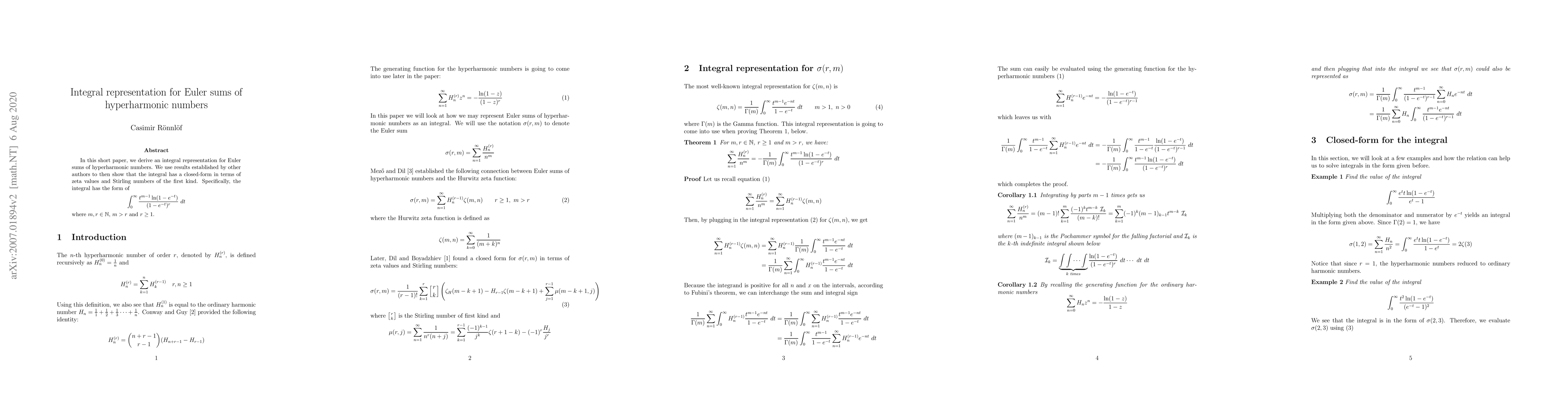 This paper derives an integral representation for Euler sums involving hyperharmonic numbers and shows that the integral evaluates to a closed-form expression in terms of zeta values and Stirling numbers of the first kind. The integral is given by $$\int_0^\infty \frac{t^{m-1}\ln(1-e^{-t})}{(1-e^{-t})^r} \ dt$$ with specific constraints on $m$ and $r$.