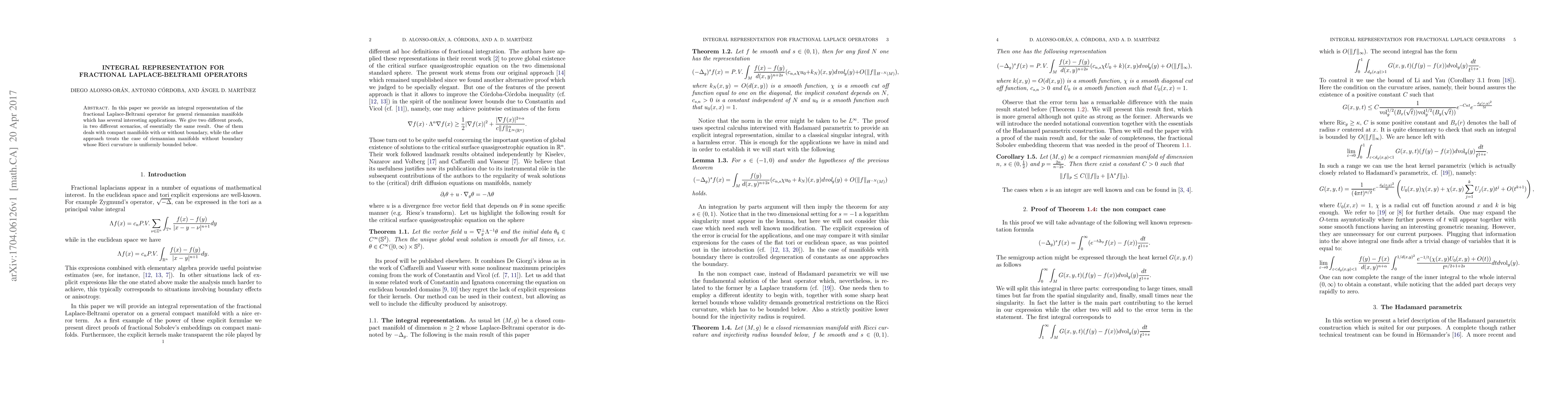 This paper presents an integral representation for the fractional Laplace-Beltrami operator on Riemannian manifolds, offering two distinct proofs applicable to compact manifolds and those with uniformly bounded Ricci curvature. The results have significant implications for various applications.