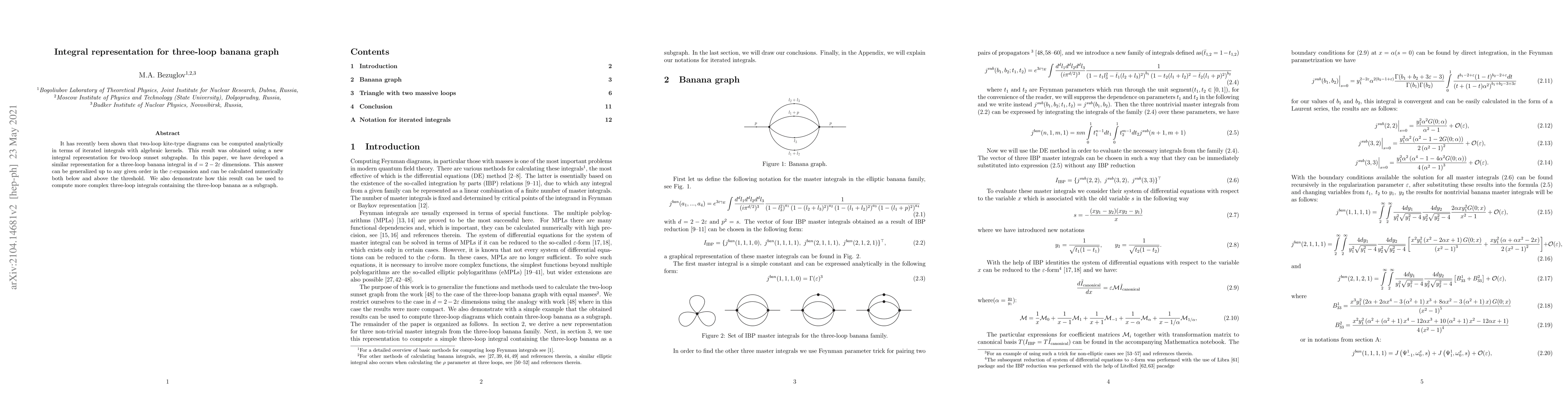 It has recently been shown that two-loop kite-type diagrams can be computed analytically in terms of iterated integrals with algebraic kernels. This result was obtained using a new integral representation for two-loop sunset subgraphs. In this paper, we have developed a similar representation for a three-loop banana integral in $d = 2-2\varepsilon$ dimensions. This answer can be generalized up to any given order in the $\varepsilon$-expansion and can be calculated numerically both below and above the threshold. We also demonstrate how this result can be used to compute more complex three-loop integrals containing the three-loop banana as a subgraph.