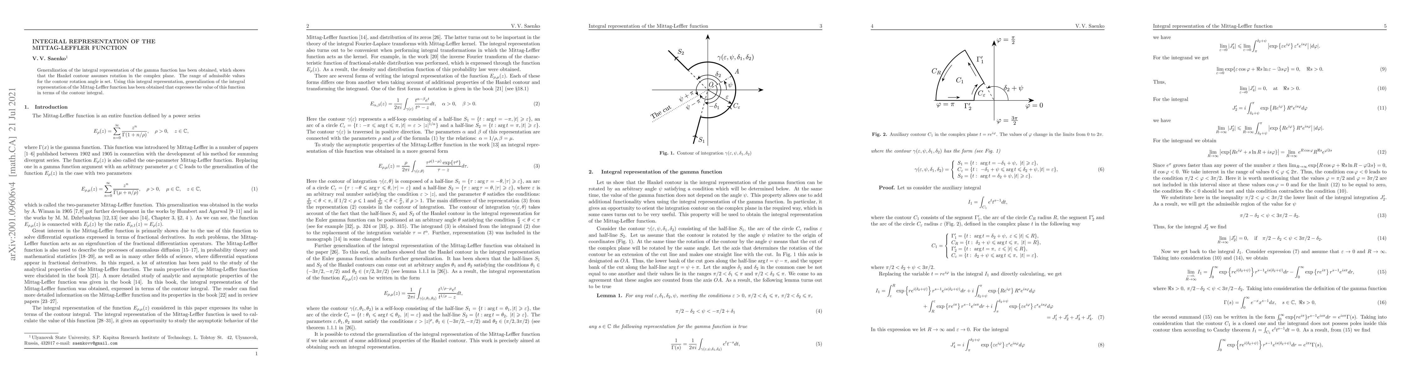 Generalization of the integral representation of the gamma function has been obtained, which shows that the Hankel contour assumes rotation in the complex plane. The range of admissible values for the contour rotation angle is set. Using this integral representation, generalization of the integral representation of the Mittag-Leffler function has been obtained that expresses the value of this function in terms of the contour integral.