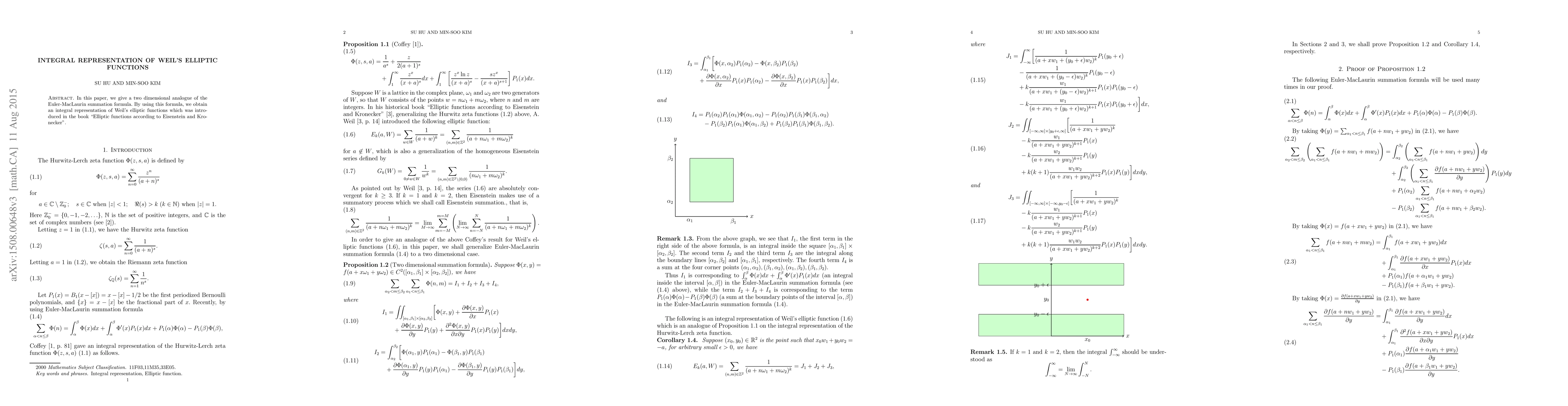 This paper presents a two-dimensional extension of the Euler-MacLaurin summation formula and utilizes it to derive an integral representation for Weil's elliptic functions, as originally discussed in "Elliptic functions according to Eisenstein and Kronecker".