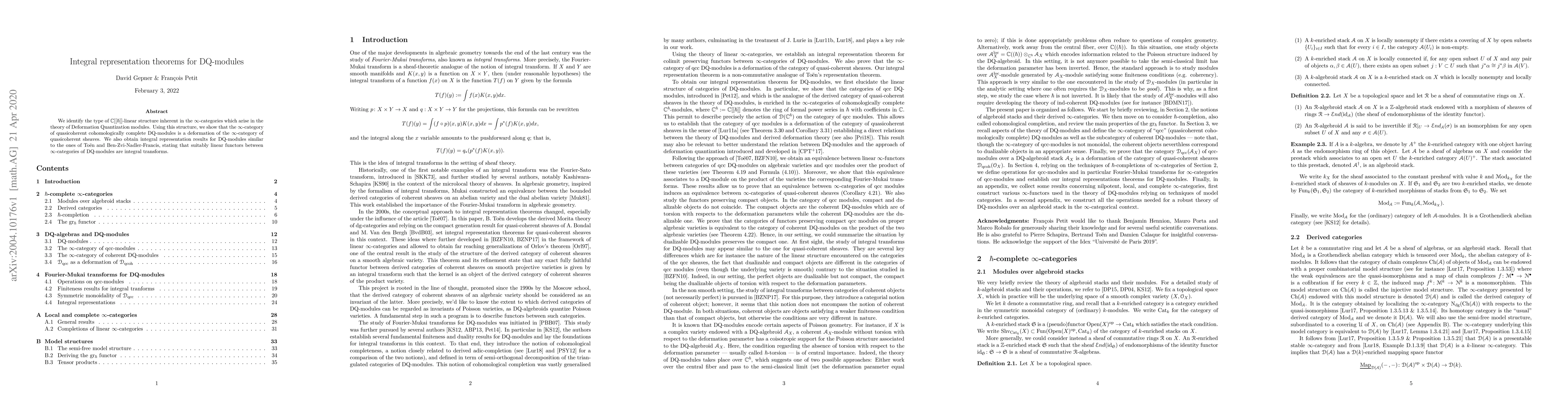 This paper identifies $\mathbb{C}[[\hbar]]$-linear structures in $\infty$-categories related to Deformation Quantization modules, demonstrating that these categories are deformations of quasicoherent sheaves' $\infty$-categories. It also establishes integral representation theorems for DQ-modules akin to those by Toén and Ben-Zvi-Nadler-Francis.