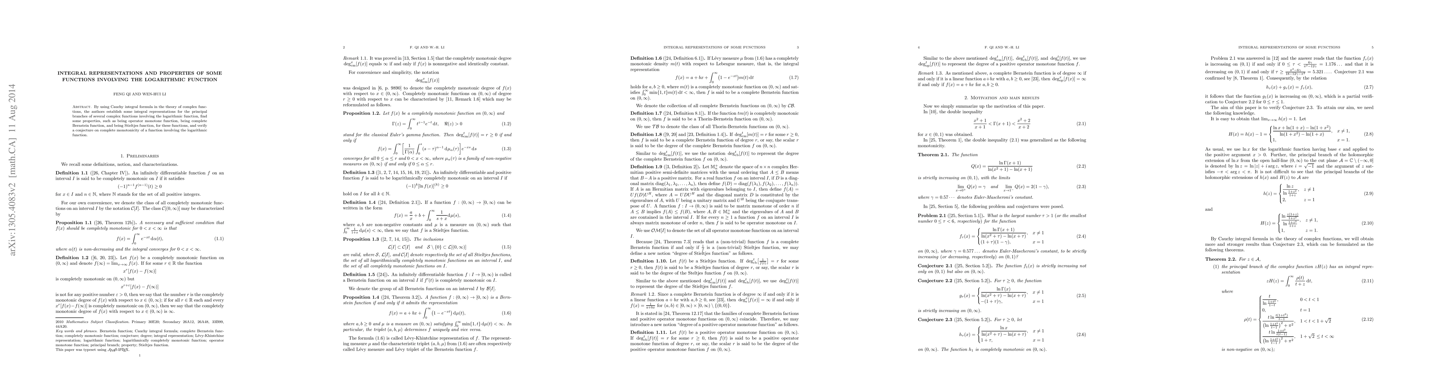 Summary: The paper establishes integral representations for complex functions involving the logarithmic function using Cauchy's integral formula, and explores properties such as operator monotonicity, Bernstein function completeness, and Stieltjes function characteristics, while also verifying a conjecture on the complete monotonicity of a logarithmic function.